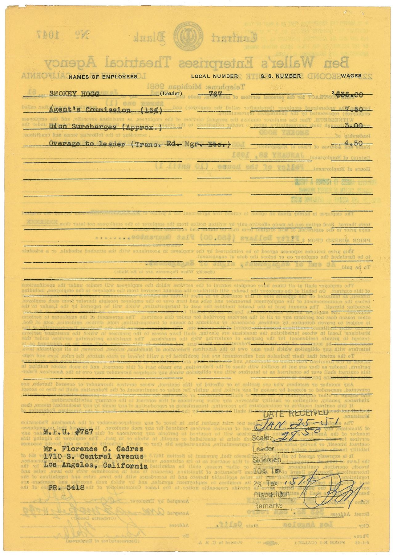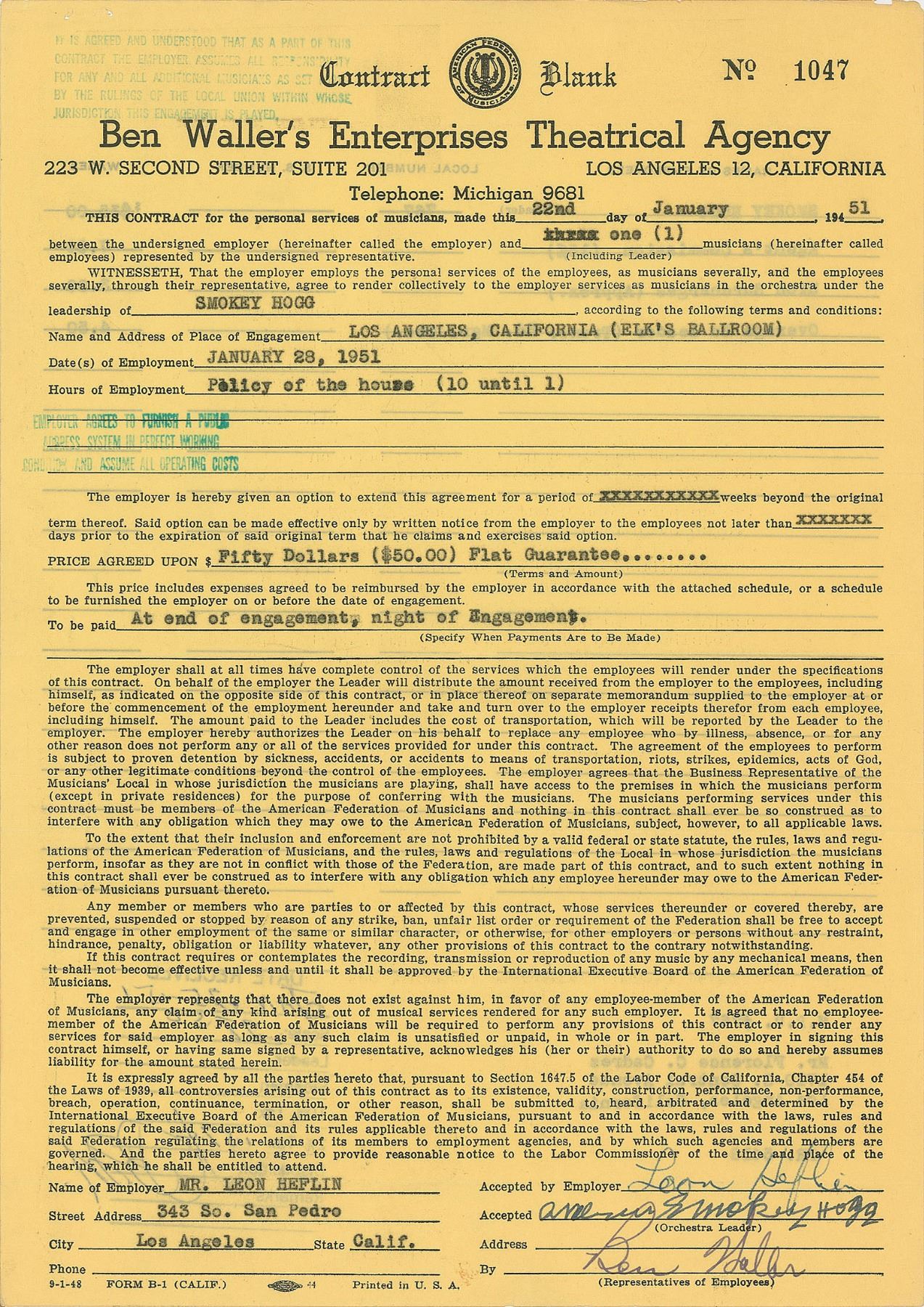 American post-war Texas blues and country blues musician (1914–1960) who was popular with record buyers in the South during the late 1940s and early 1950s; he was influenced by Big Bill Broonzy, Peetie Wheatstraw and Black Ace. DS, signed “Andrew Smokey Hogg,” one page, 8.5 x 12, January 22, 1951. Ben Waller's Enterprises Theatrical Agency contract in which Smokey Hogg agrees to perform at Elk's Ballroom in Los Angeles on January 28, 1951, for a sum of $50. Signed at the conclusion in black ink by Hogg. In fine condition.