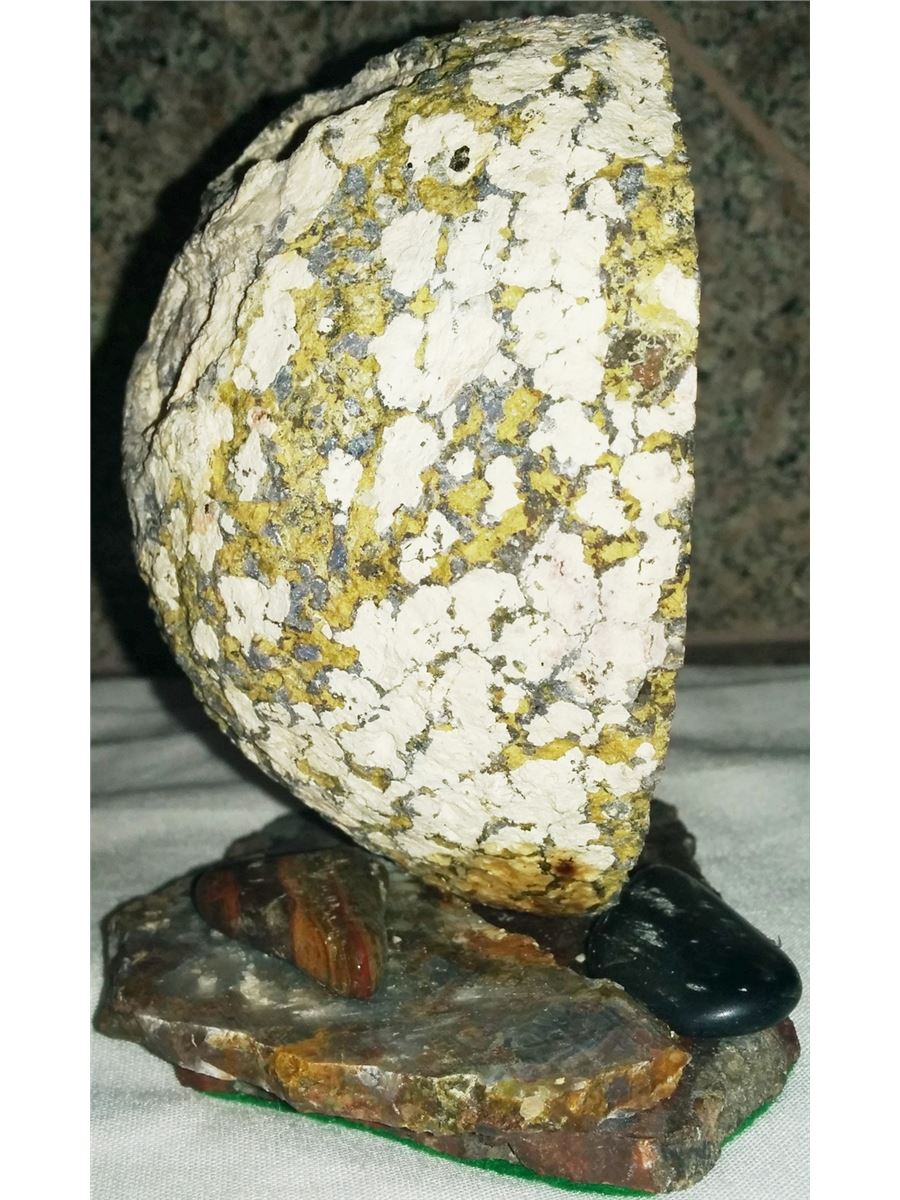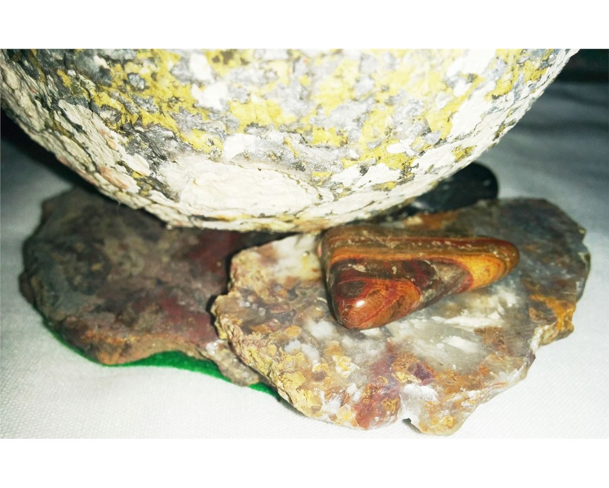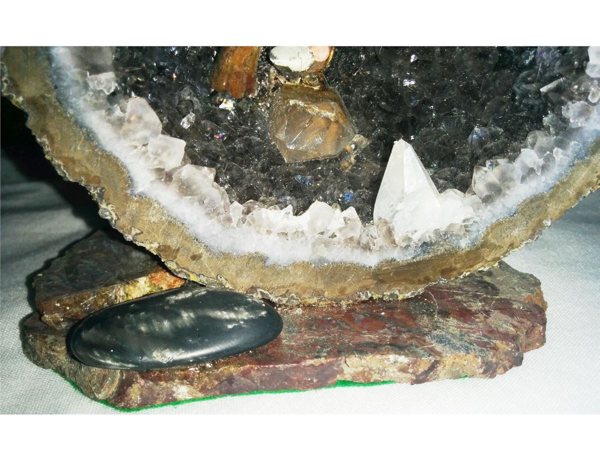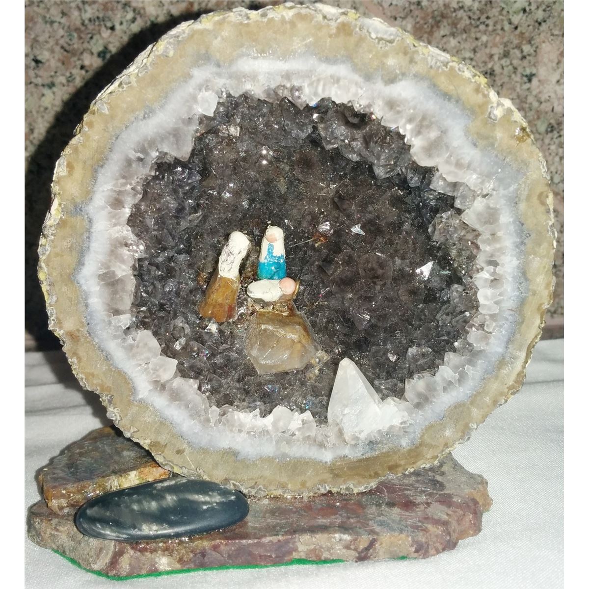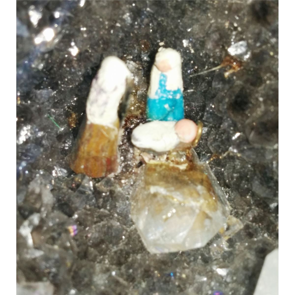 Smokey Quartz Geode w/Miniature Nativity Scene. Item is approx. 4 1/2" x 4 1/2". This item is perfect for holiday decorating or for gift giving. Geode has been decorated with petrified wood and polished stones. Nativity figures inside are very tiny. Condition: Good, see pictures. Shipping: $20.00.