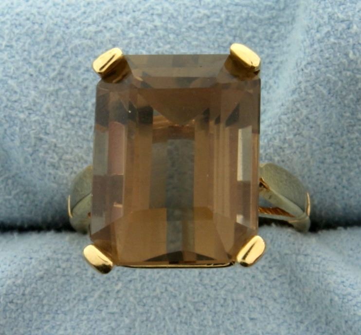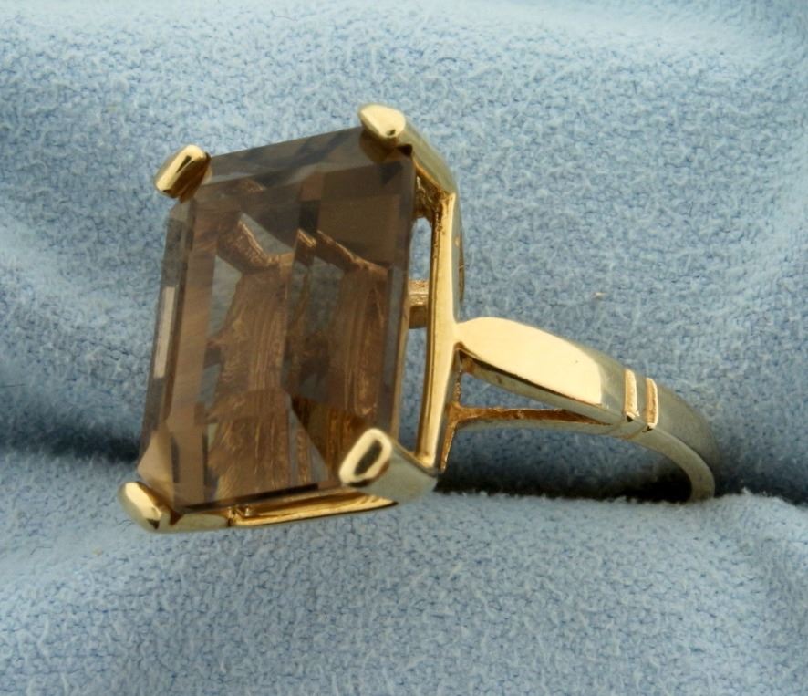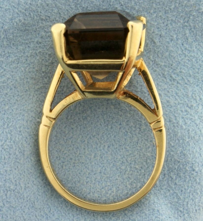 In 14k yellow gold, containing a rectangular shaped 16x12mm smokey quartz gemstone. Size 6 1/2. 8.2g.