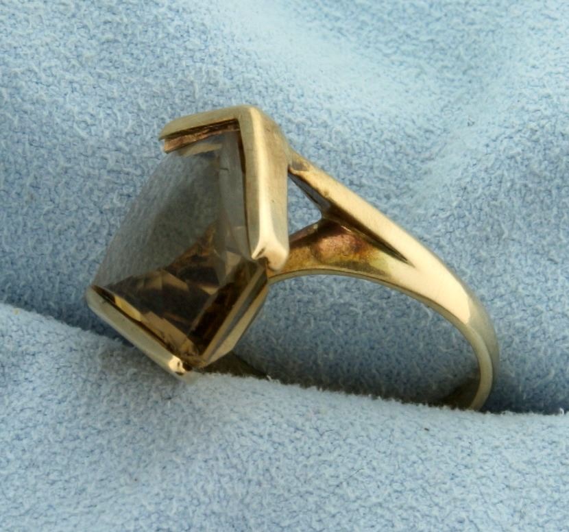 In 14k yellow gold, containing pentagon shaped smokey quartz gemstone 16x12mm. Size 5 1/2. 6.2g.