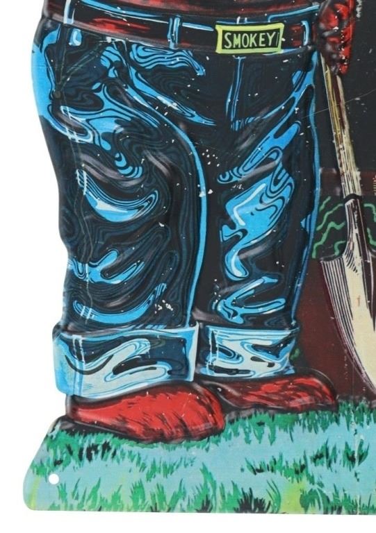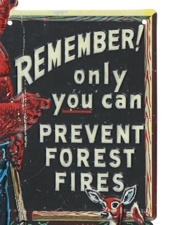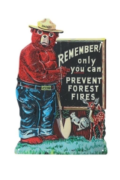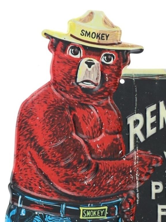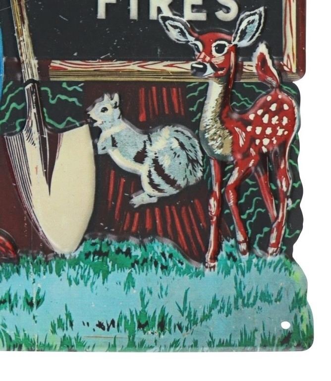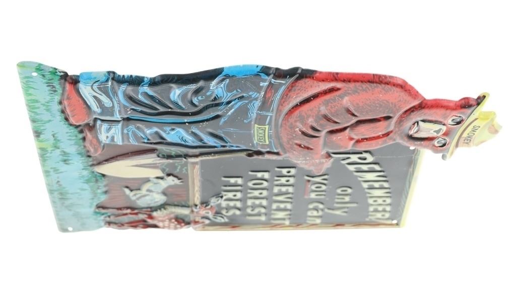 Featured in this lot is a Smokey the Bear embossed polychrome sign. The sign features a wonderfully and professionally crafted tin construction. The sign shows a metal construction with an all white back. On the front it shows Smokey The Bear on the left side of the sign pointing to a sign on a tree reading, "Remember! Only You Can Prevent Forest Fires". Below the sign is a small deer and squirrel. Smokey is wearing his iconic outfit, blue jeans, his yellow "Smokey" belt and his tan "Smokey" ranger hat. The overall condition of this advertisement sign is good with no obvious signs of damage. Some have noted this is 1970s, but likely a contemporary sign. The sign measures 15 11/16" L x 10 3/4" W.*