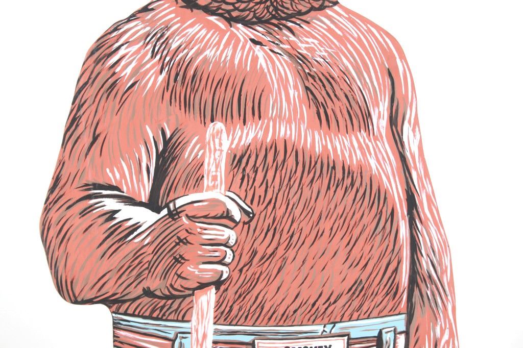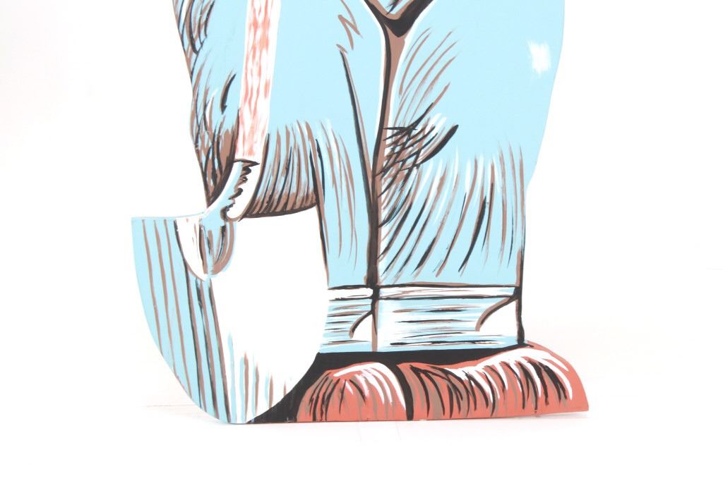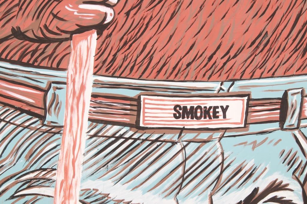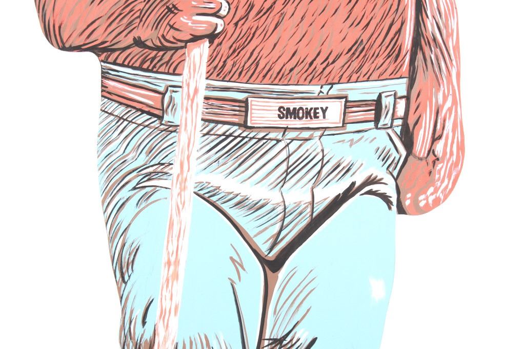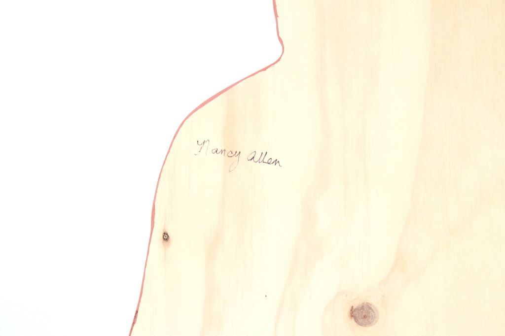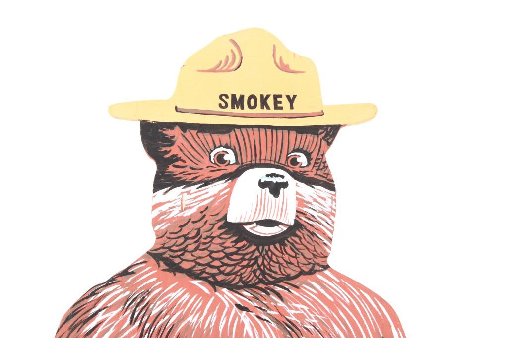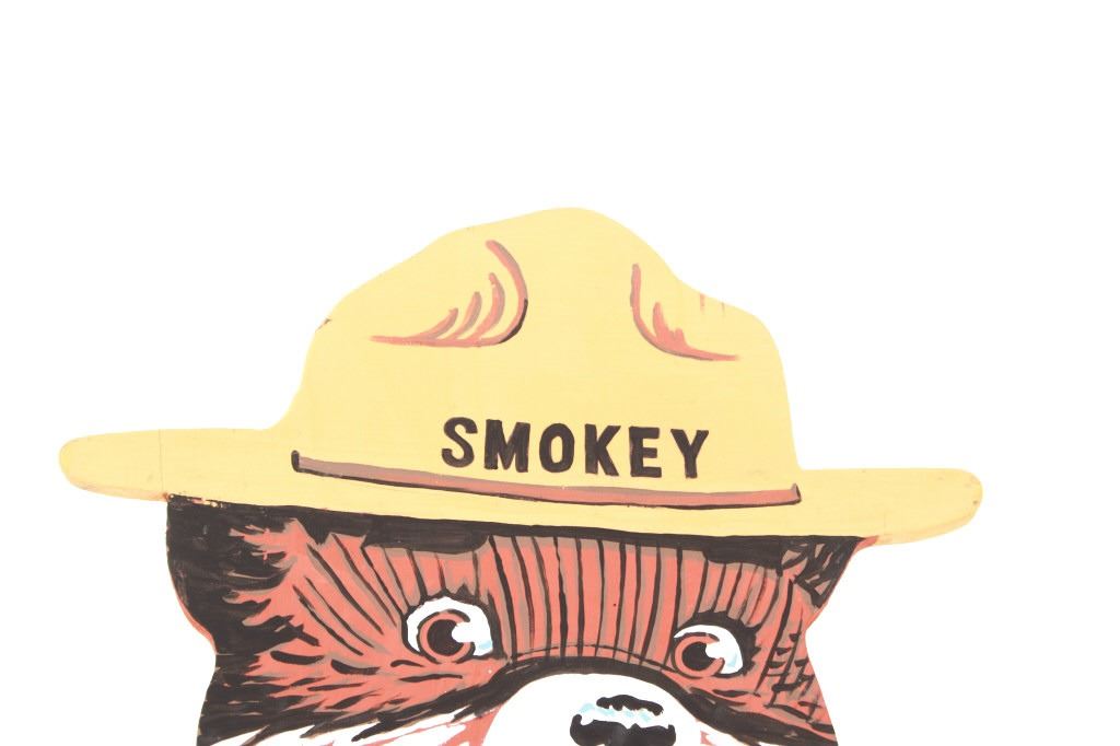 Featured in this lot is this original work of art hand painted on wood sign of a life size, large Smokey The Bear Sign. The work of art is signed on the back, “Nancy Allen” and is cut from a piece of plywood then hand painted. The piece shows the classic full body Smokey The Bear with the Smokey Forest Ranger hat, shirtless bear wearing blue jeans held up by a Smokey belt buckle and holding a spade shovel. Truly a fantastic piece that would be the key piece in any Smokey The Bear, National Park Forestry or Yellowstone National Park collection. The sign is a handmade art piece by Nancy Allen made in the same likeness of the U.S. Forest Service Smokey The Bear signs giving the daily fire danger rating. The condition of this Smokey sign is good with no obvious signs of damage and shows good overall condition. The measurements of this sign is 67 3/4" x 26 3/4" x 3/4". The collective weight of this sign is 15lb 8oz.