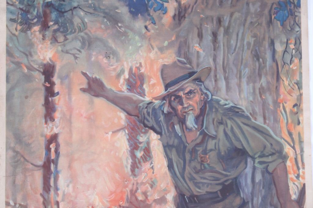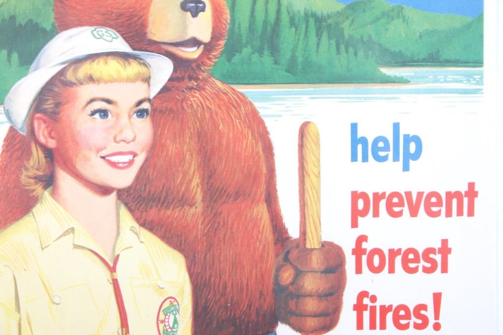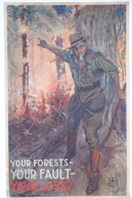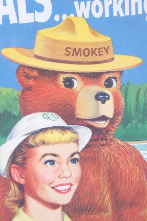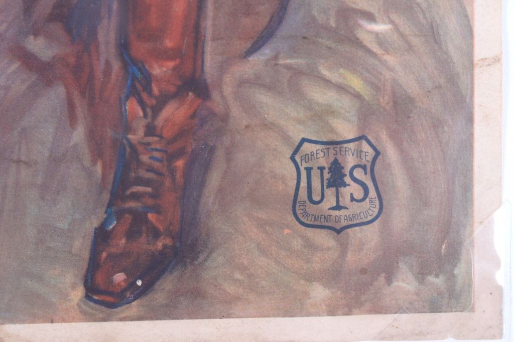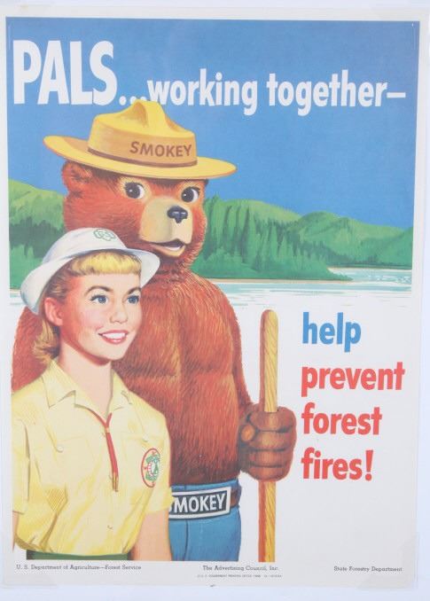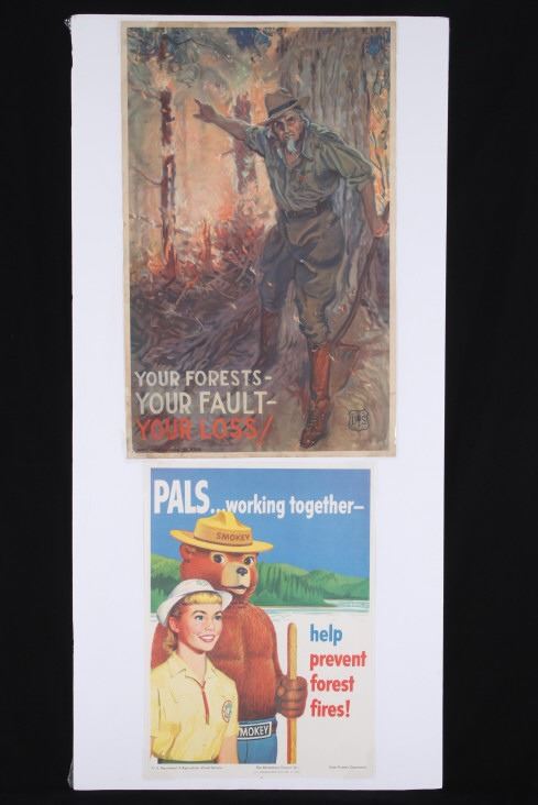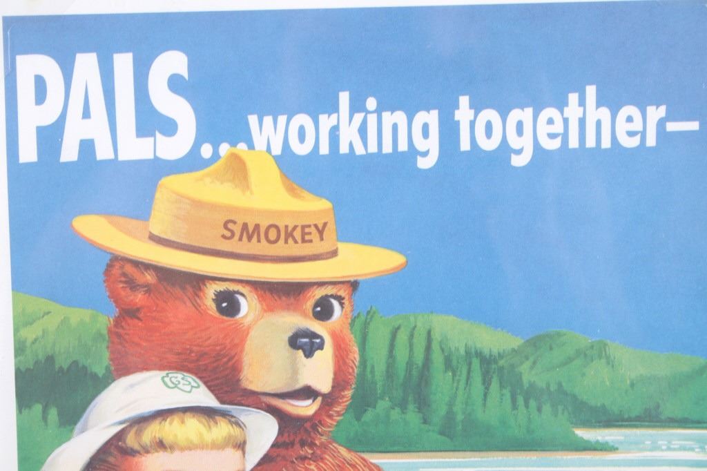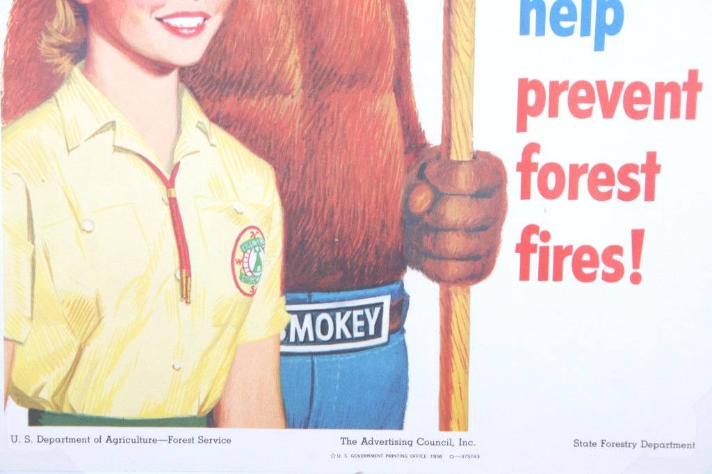 Featured in this lot is this pair of Smokey the Bear and U.S. Forest Service fire awareness signs. There are two signs in this collection. The first is a Smokey the Bear U.s Department of Agriculter - Forest Service sign that is made from The Advertising Council, Inc. and printed from the U.S. Government Printing Office in 1956 and from the State Forestry Department and reads: Pals... working together - help prevent forest fires! The second is a U.S. Forest Service Department of Agriculture fire awareness sign that shows a man in a burning forest and reads: Your Forests- Your Fault - Your Loss! and was created by James Montgomery Flagg. The condition of this pair signs is good with no obvious signs of damage and shows good overall condition. The measurements of these signs are 14" x 10 1/8" and 18 3/4" x 11 7/8".
