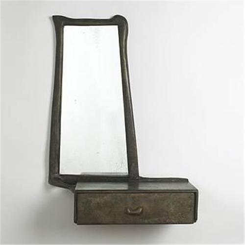Smokey Tunis console USA, 1969 carved and stained wood, mirrored glass 17.5 w x 8 d x 23.5 h inches Hand-painted signature to side: [Tunis 69].
