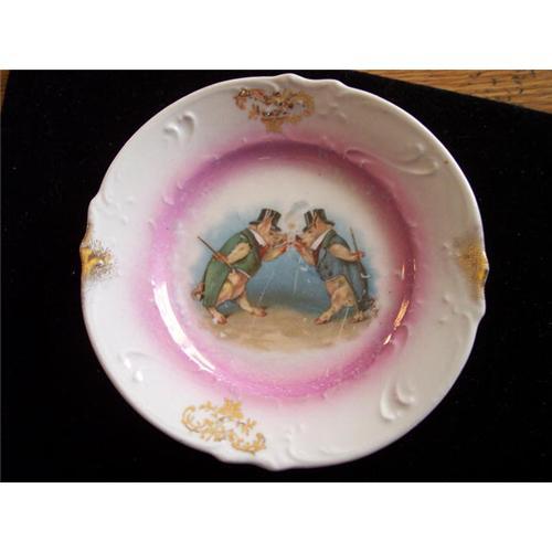 Such an unusual little plate.Has two pigs dressed up and smoking.Has a few scratch marks on front but no chips or cracks.Measures 5 1/4" across. No markings on back but probably German.
