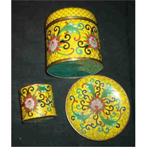 Three pieces. Round covered cigarette box, round open Match holder with striker on the bottom and a round ashtray, There three small places on the underside of the ahtray that show wear. Non are visible from the top.
