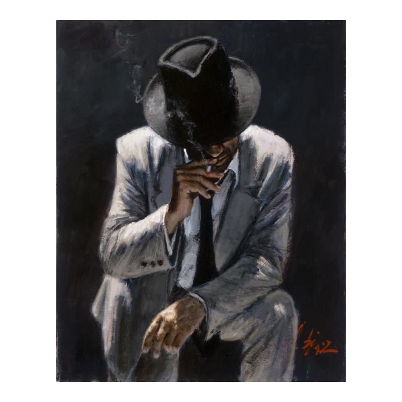 "Smoking Under the Ligth with White Suit" is a hand embellished limited edition giclee on stretched canvas by Fabian Perez. The piece is numbered and hand signed by the artist and comes with a Certificate of Authenticity. Measures approx. 16" x 13" (image). Please allow 5 additional business for items that include canvas stretch or framing.