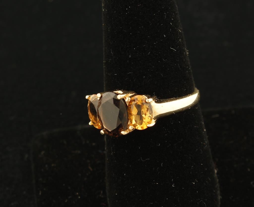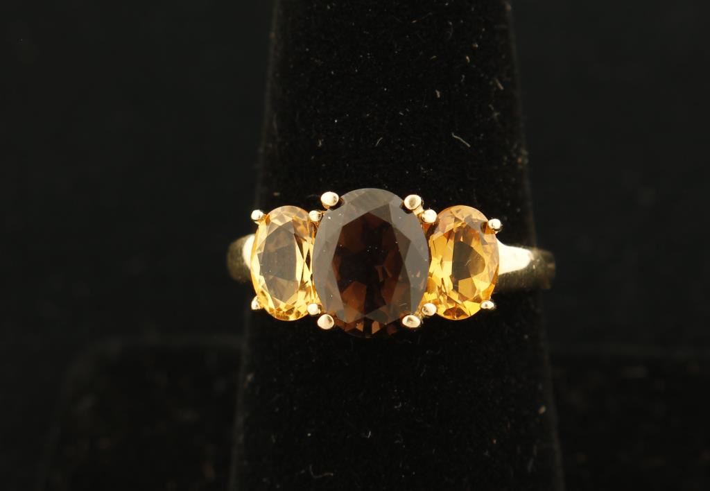 Colorful smoky quartz and citrine ring in 14K yellow gold. The smoky quartz is the centerpiece of this ring, being about 1 3/4 carats and showing flashes of red. It is accented with two oval citrines that total 1.7 carats. All set in a modest 14k yellow gold mount that lets the gemstones shine. Just like citrine, smoky quartz is a birthstone for November. The ring is a size 8 and weighs 3.8 grams.