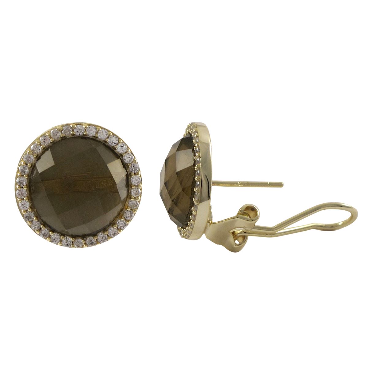 Smoky Quartz Semi Precious Faceted Stone, Set In Gold Tone Sterling Silver With CZ Border, 15Mm Round Stud Post Clip Earrings
