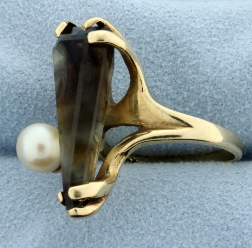 14k Yellow Gold. Smoky Quartz is in 24x11 very unique triangle shape. 6.1mm pearl. Size 6. 6.4g