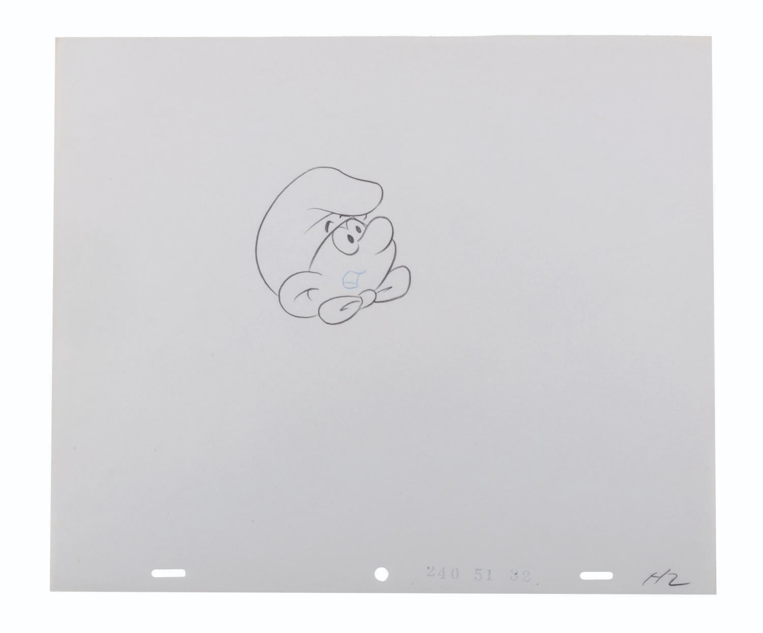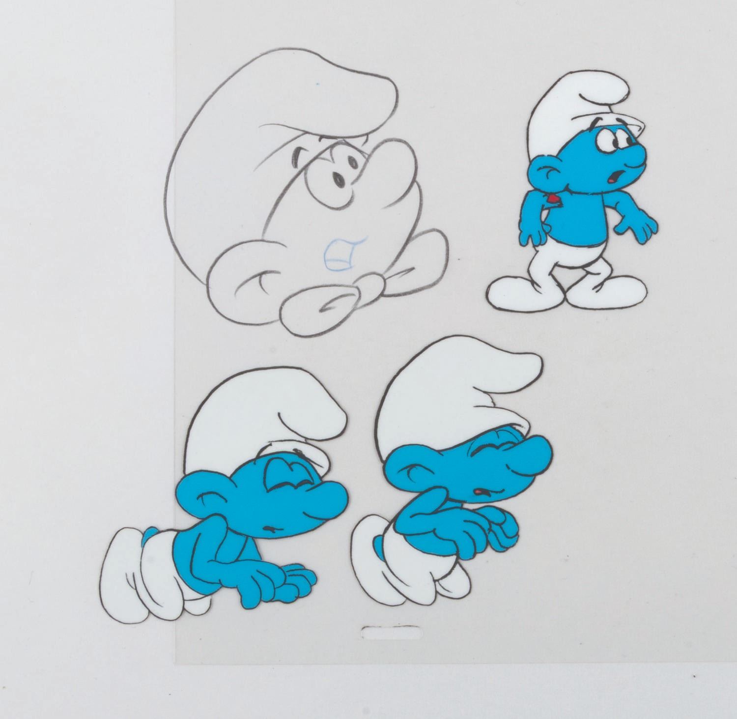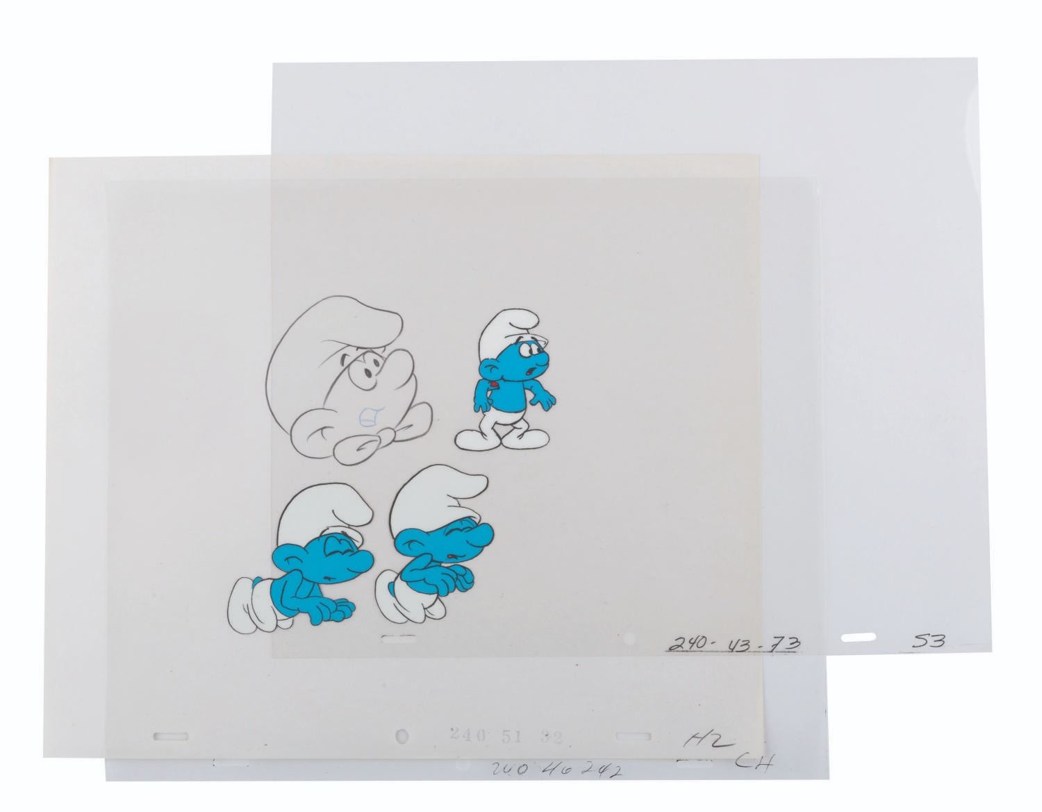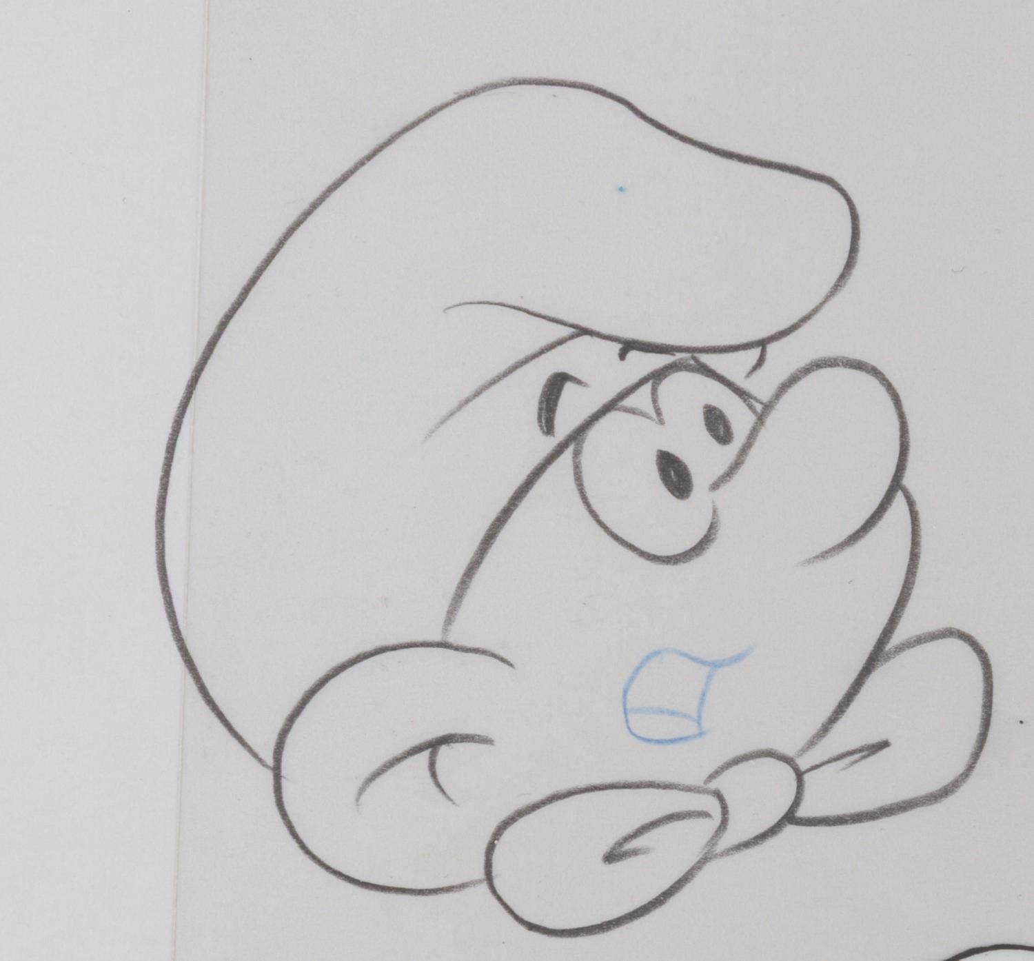 (Hanna-Barbera, 1981-89) A collection of two production cels and a drawing from"The Smurfs." The Smurfs have image sizes of 3" x 4.75" and 1.75" x 2.5" on 10.5" x 12.5" cels. The drawings have image sizes of 6.75" x 12" and 3" x 3" on 10.5" x 12.5" animation paper. The art is all in very good condition with light wear typical of production use.