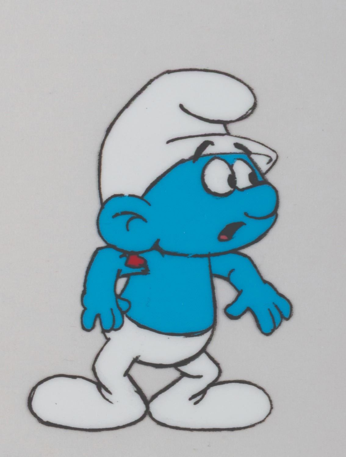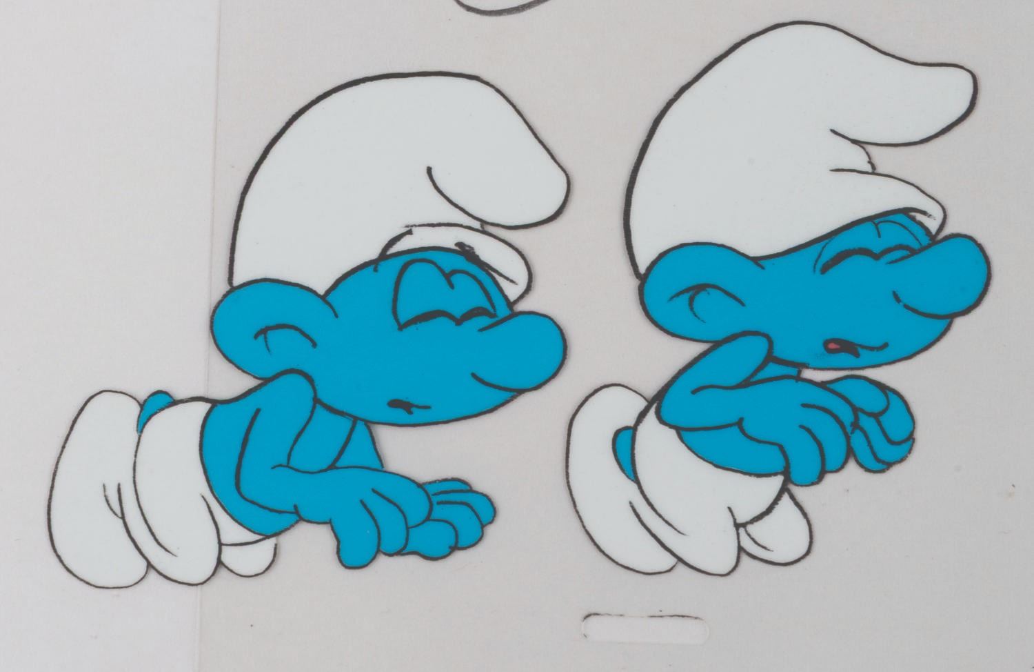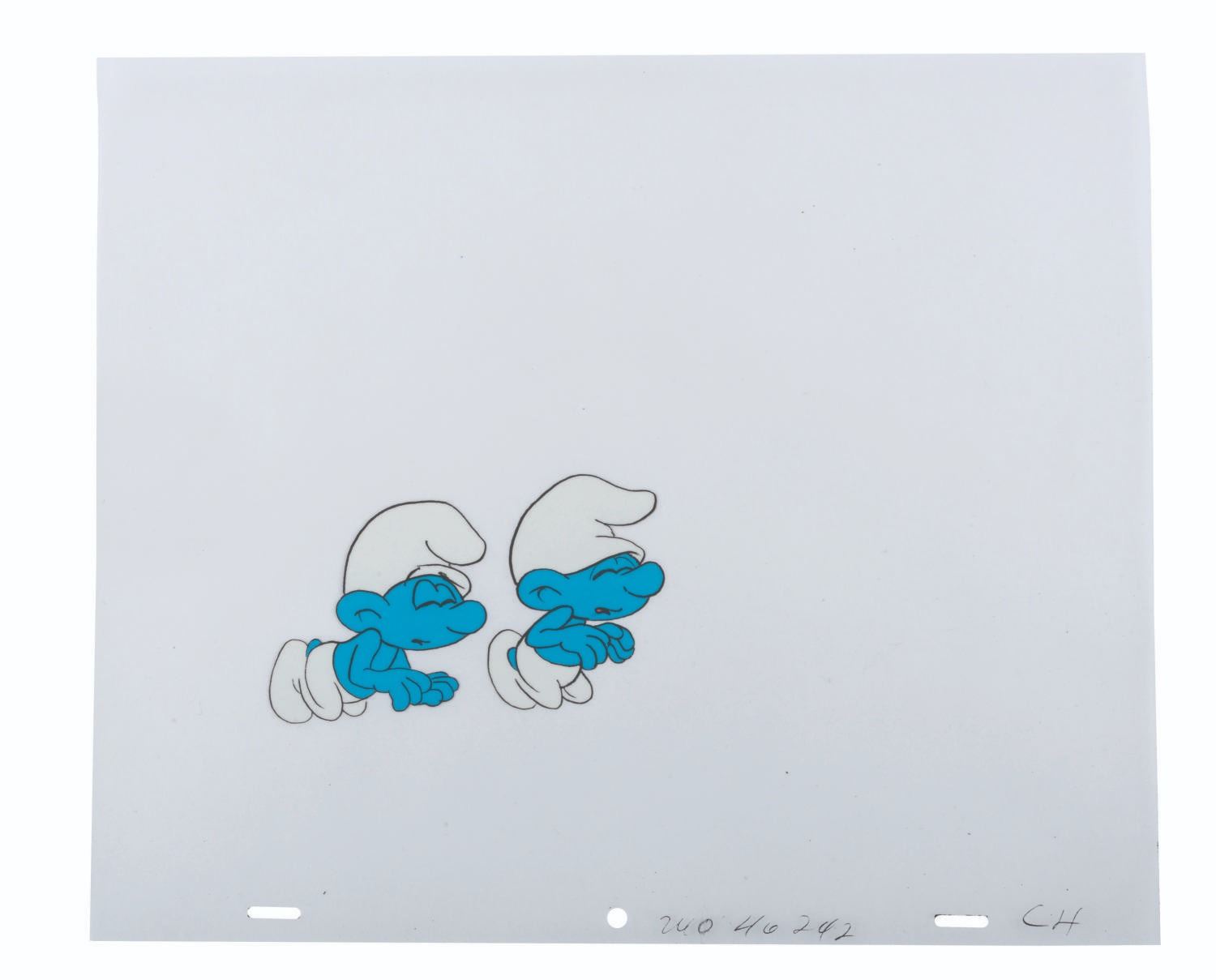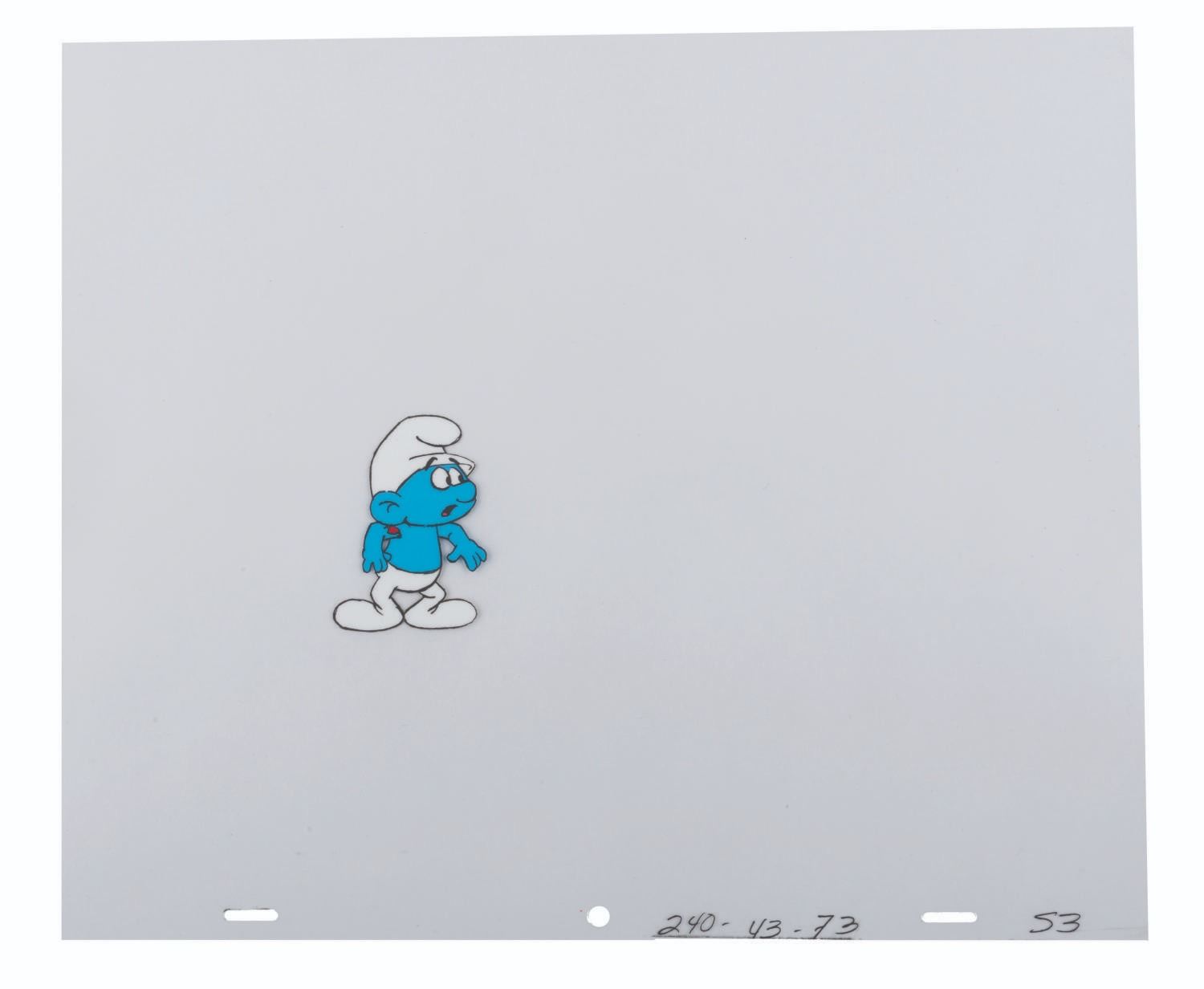 (Hanna-Barbera, 1981-89) A collection of two production cels and a drawing from"The Smurfs." The Smurfs have image sizes of 3" x 4.75" and 1.75" x 2.5" on 10.5" x 12.5" cels. The drawings have image sizes of 6.75" x 12" and 3" x 3" on 10.5" x 12.5" animation paper. The art is all in very good condition with light wear typical of production use.