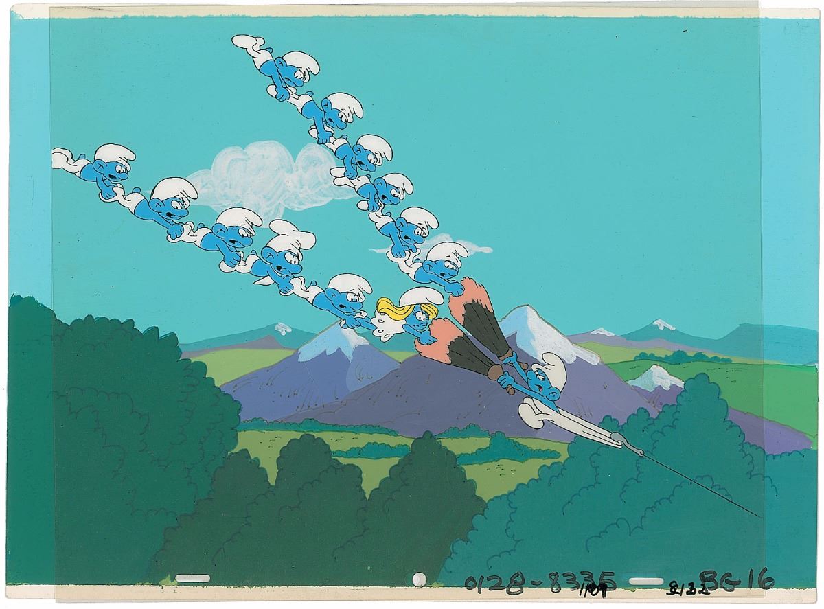 (Hanna-Barbera Studios, circa 1970s) Original production cel and production background featuring Smurfs from the Smurfs TV show, showing thirteen of the little blue creatures in a perilous situation. The cel is placed on a hand-painted production background. Character images each measure about 1 x 1, with a total image size of 10 x 8. Overall dimensions are 14.5 x 10.5. In fine condition.