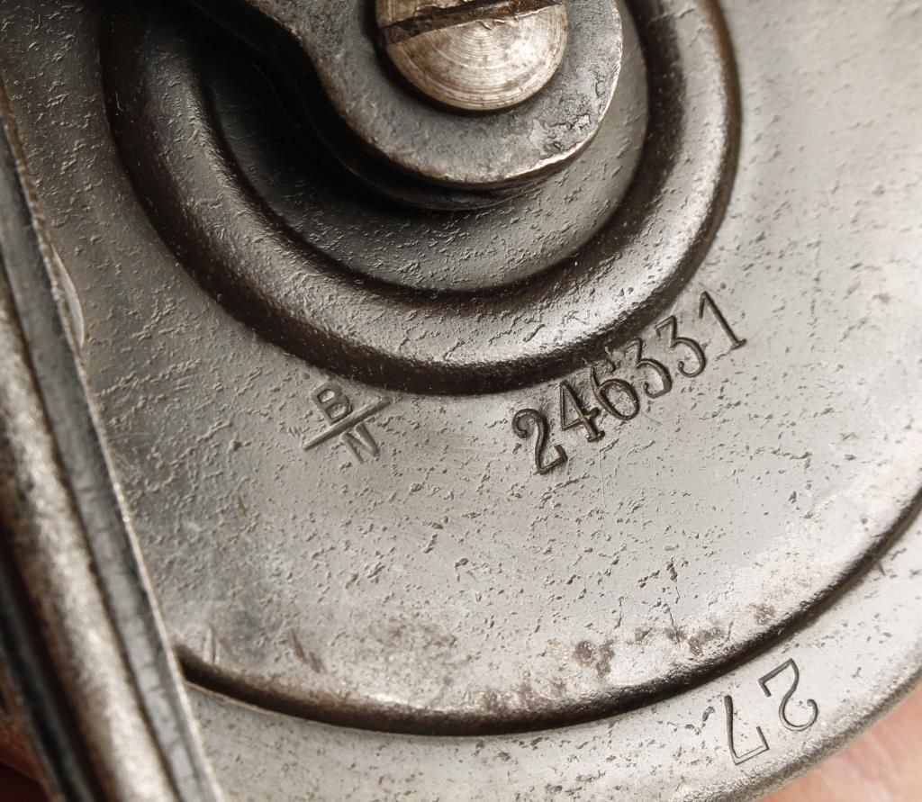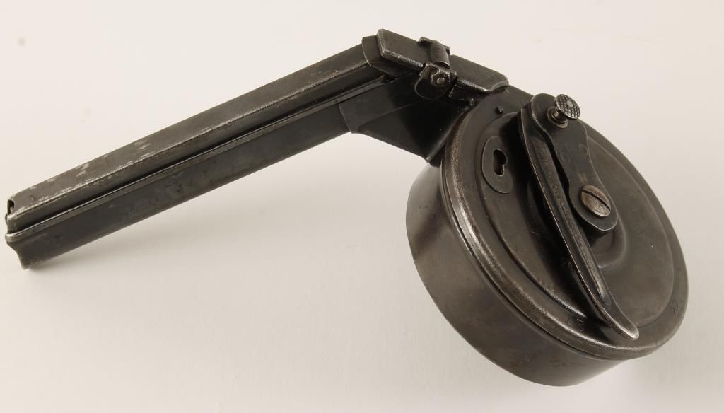 Second variation of the 32-round magazine for Luger (P08) pistols or MP18/I submachine guns. Serial number is 246331. Also stamped with the "B" over "N" to signify manufacture by Bing of Nuremburg. Condition is very good plus to near fine. Good markings.