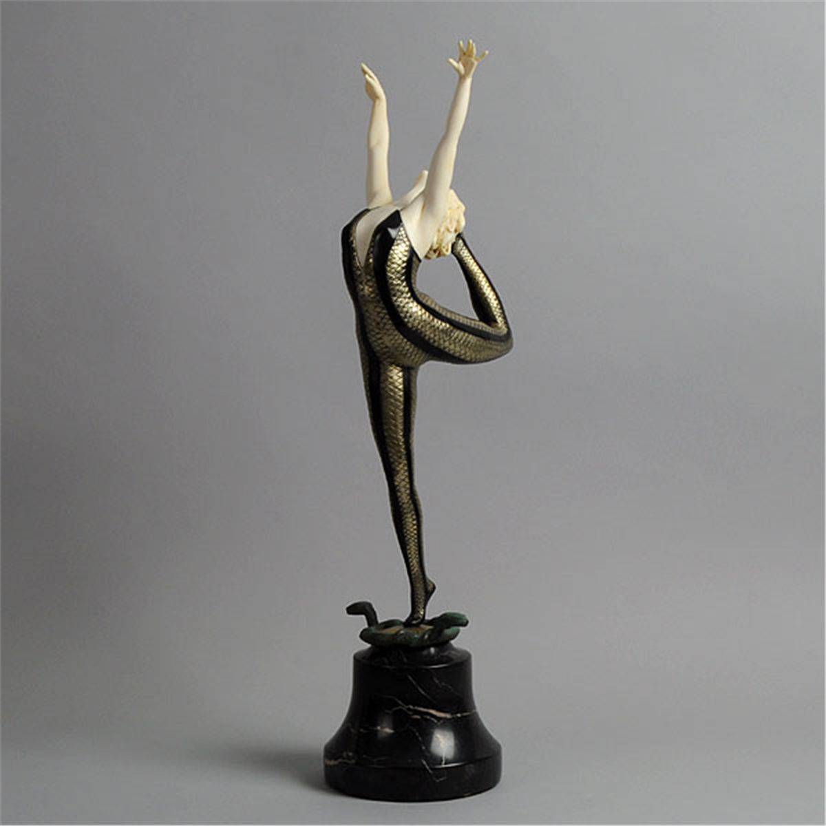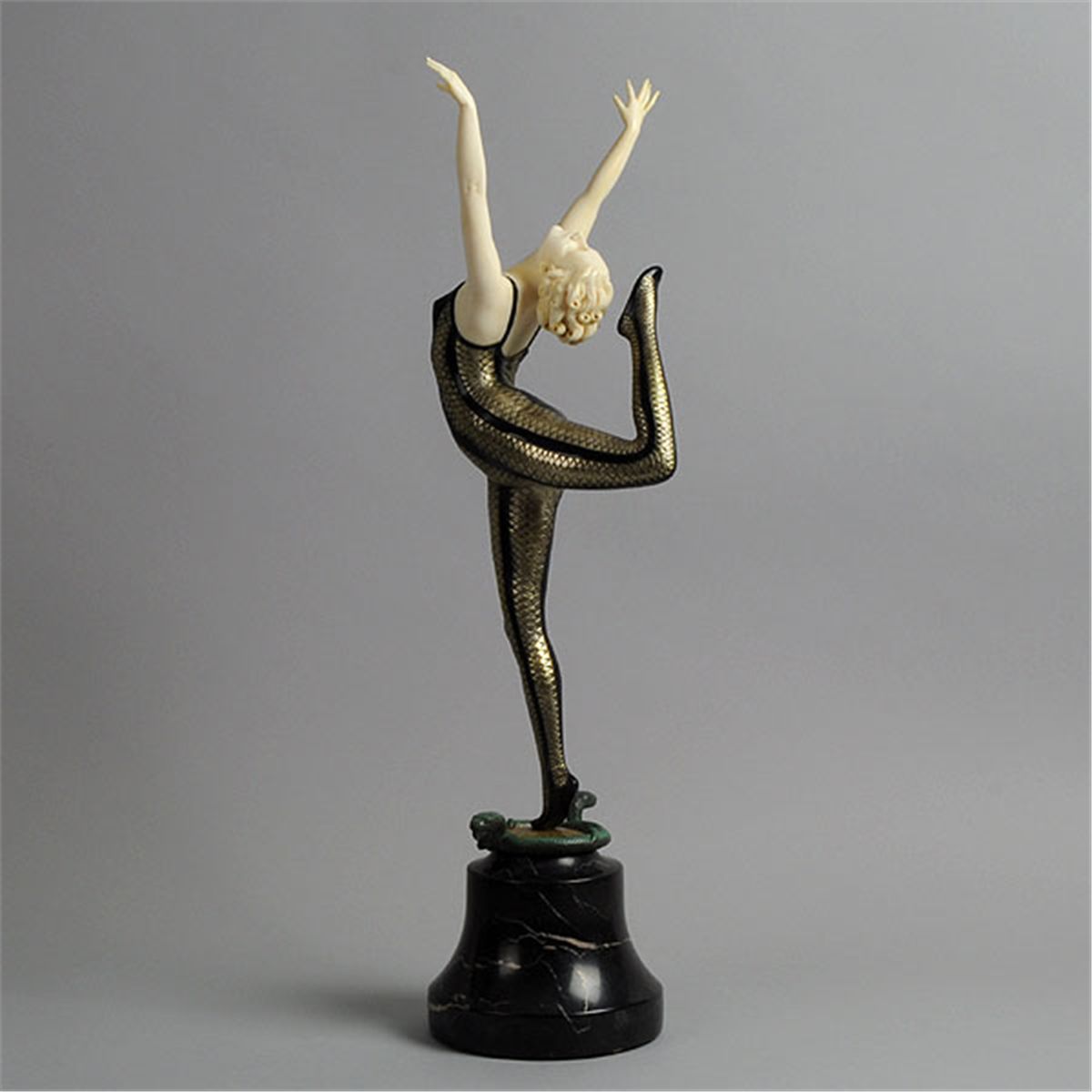 A magnificent early 20th Century cold painted & enamelled bronze and hand carved ivory figure of a sensuous and seductive dancer in stretched pose with skin tight leotard costume, raised on a black marble plinth, signed. By Otto Poertzel, 30"H