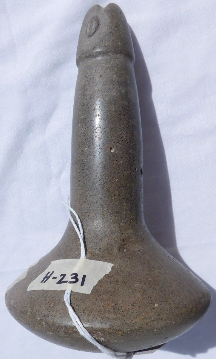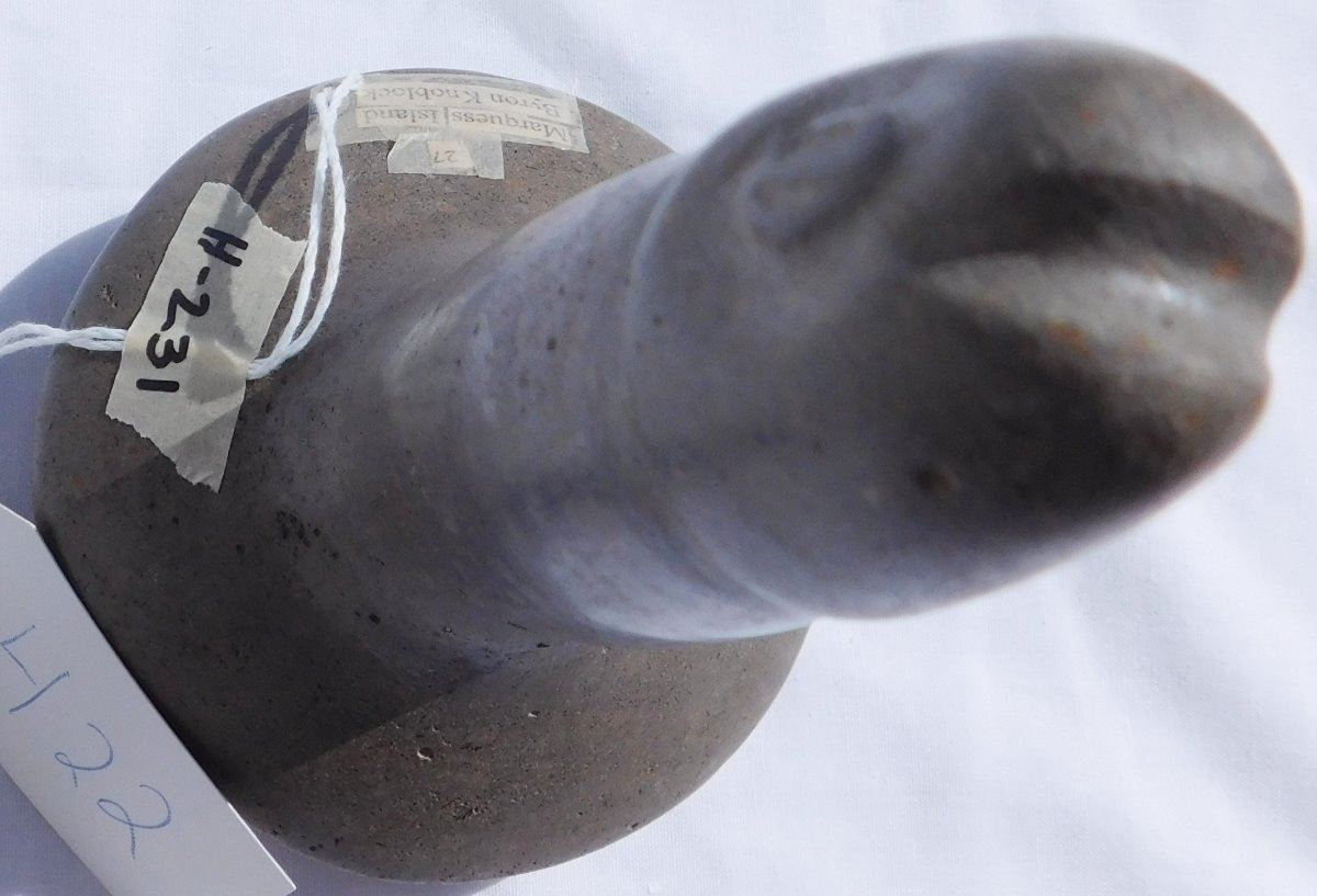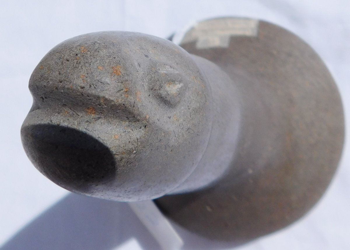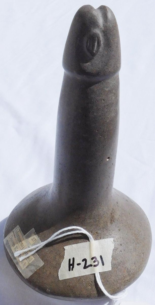 Snake Effigy Poi Pounder, pre-historic item. Made of basalt, the item measures 4.75" x 4.75" x 8". From Marquesas Island, ex-Byron Knoblach. Great snake effigy carving on handle. Condition: Excellent condtion, fantastic polish from use, see images. Shipping: $40.00 USA estimate only, insured w/signature, double-boxed.