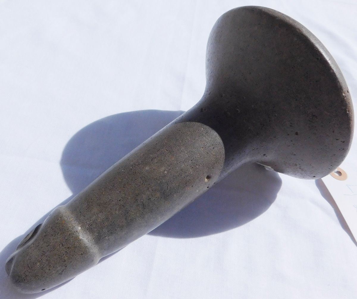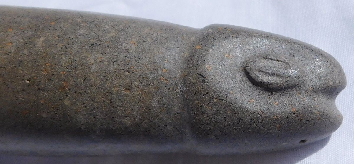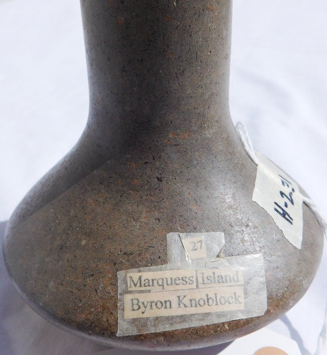 Snake Effigy Poi Pounder, pre-historic item. Made of basalt, the item measures 4.75" x 4.75" x 8". From Marquesas Island, ex-Byron Knoblach. Great snake effigy carving on handle. Condition: Excellent condtion, fantastic polish from use, see images. Shipping: $40.00 USA estimate only, insured w/signature, double-boxed.