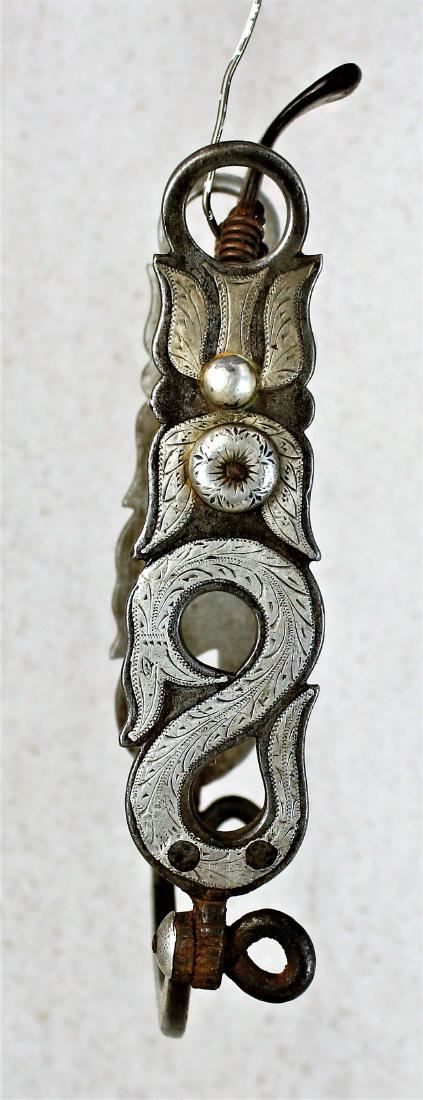 Great early solid jaw spade bit with large snake cheek pieces, mounted with intricately engraved silver, and topped with a great spade mouthpiece..