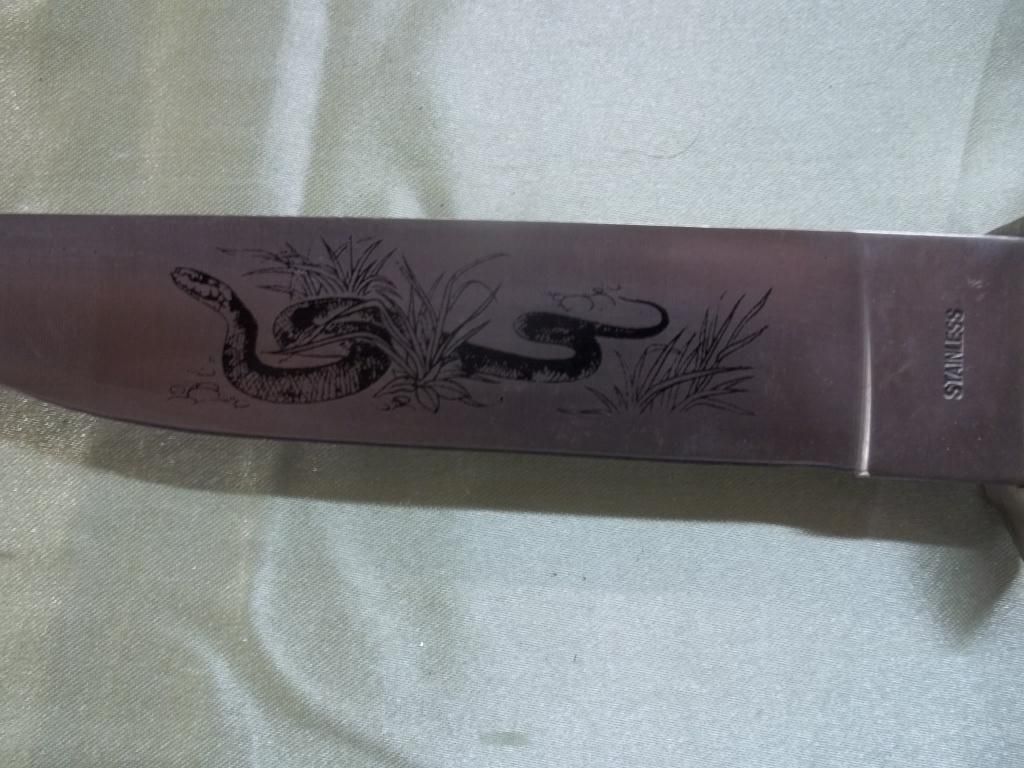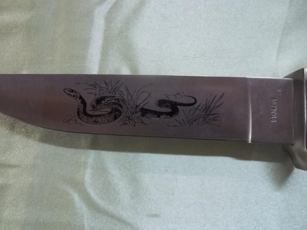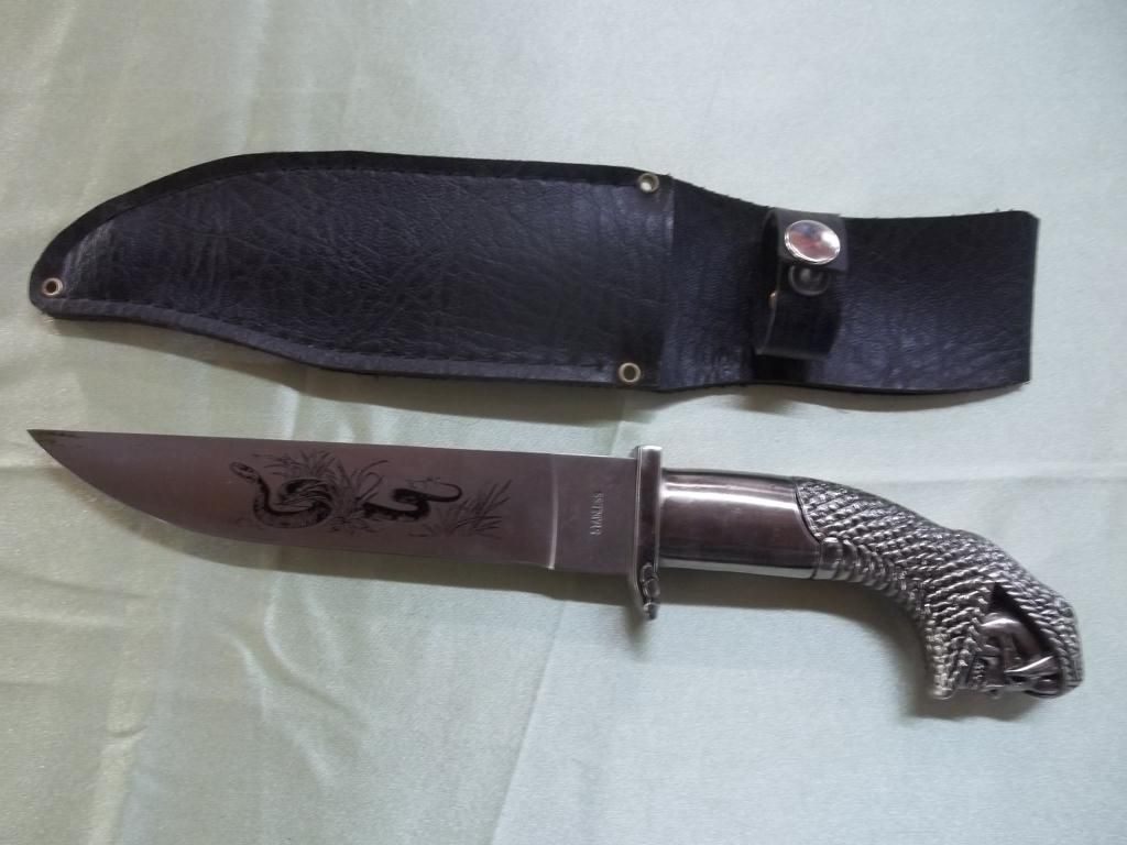Steel Blade, Black Etched Snake On Blade, Steel Handle W/Skull Inside Snakes Mouth & Leather Sheath.