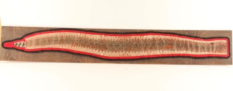 Rattlesnake skin on red and black felt mounted on board. Skin measures 48", board 8"x52".