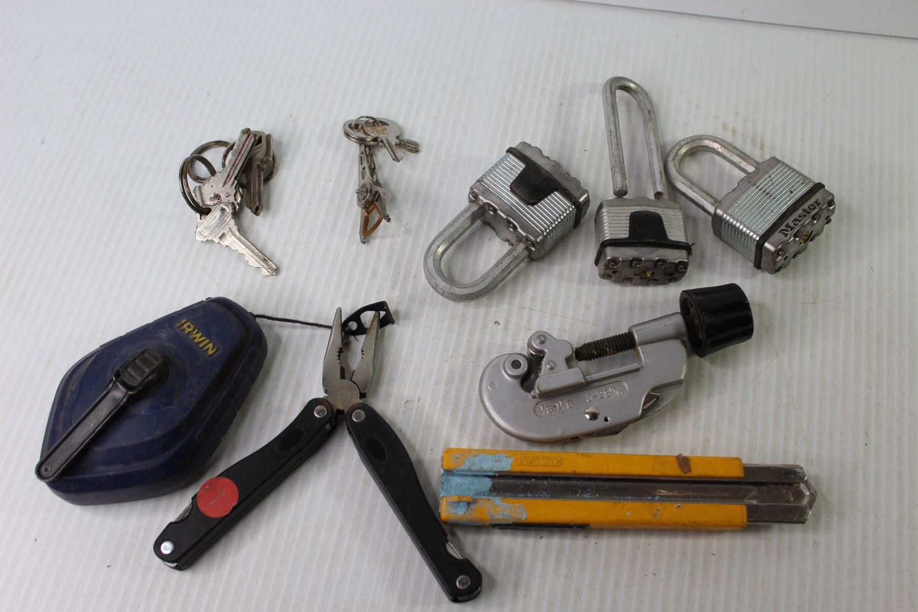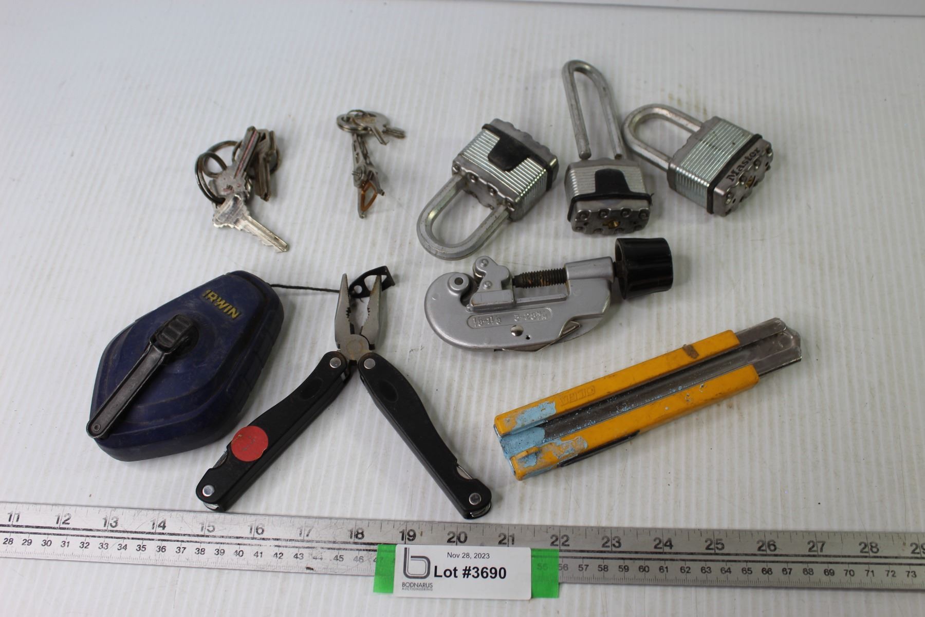 Snap Chalk Line - Keys - Multi Tool - Utility Knife - (3) Yale Locks (no keys) - Pipe Cutter