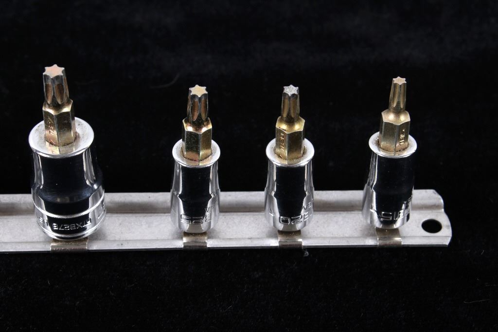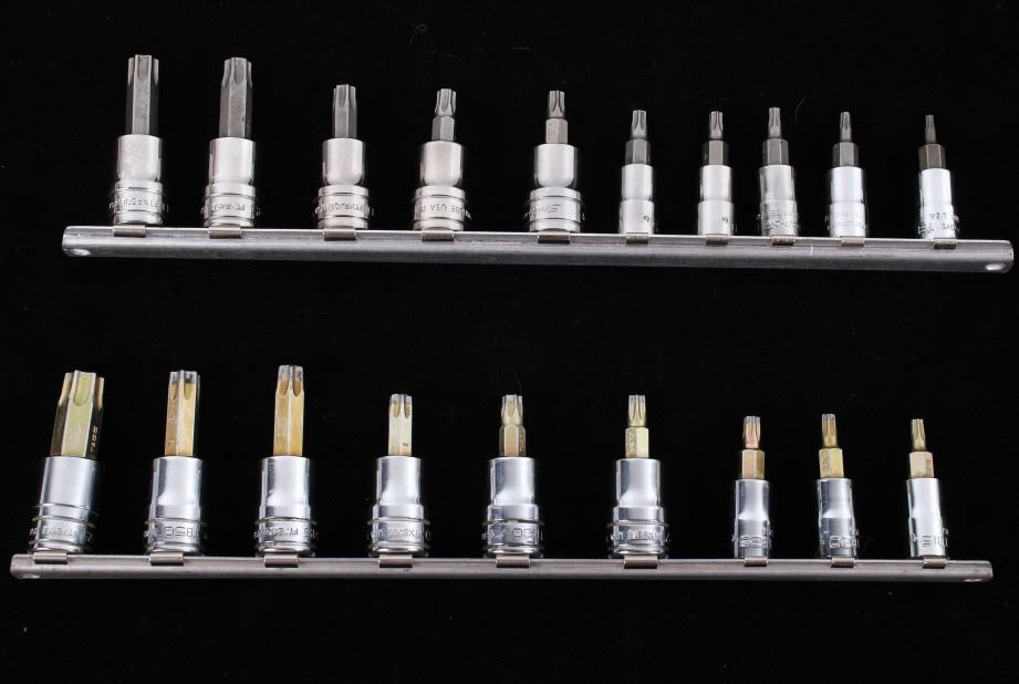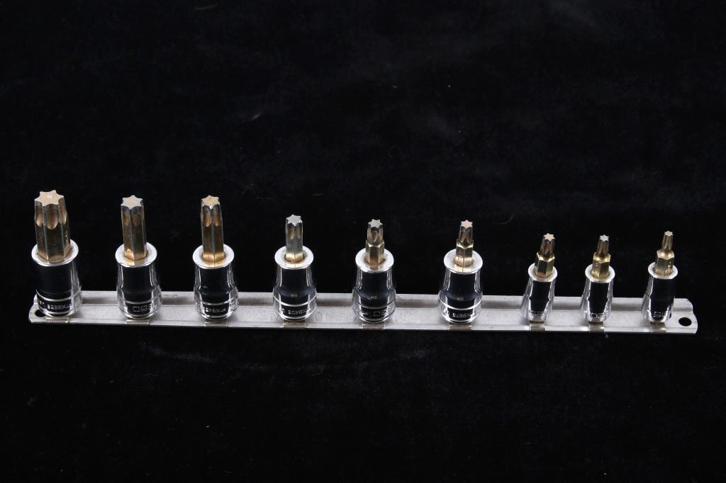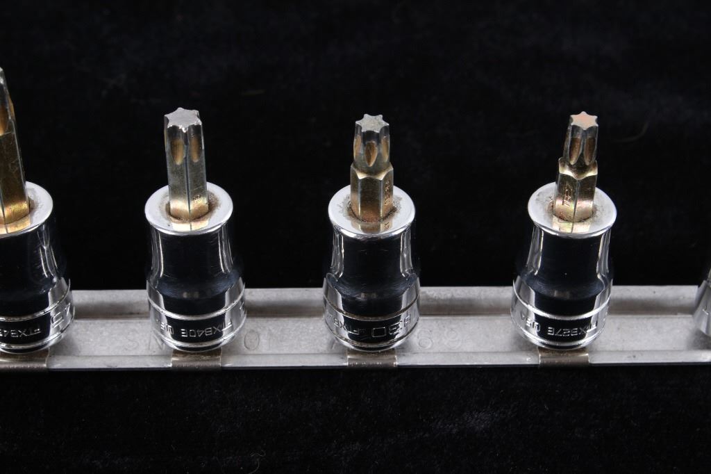 Featured in this lot is this collection of Snap-On SAE TORX security and combination male drive sockets. There are 19 total drive sockets in this collection the security star drive sockets include serial numbers such as: T50 - FTXR50E, T45 - FTXR45E, T40 - FTXR40E, T30 - FTXR30E, T27 - FTXR27E, T25 - TTXR25E, T20 - TTXR20E, T15TTXR15E, T10 - TTXR10E, T8 - TXXR8E. The combination Star drive sockets include serial numbers as follows: TB55 - FTXB55E, TB50 - FTXB50E, TB45 - FTXB45E, TB40 - FTXB40E, TB30 - FTXB30E, TB27 - FTXB27E, TB25 - TTXB25E, TB20 - TTXB20E, TB15 - TTXB15E. The condition of this set of male socket bits is fair with very little wear to use on the security bits but some wear consistent with use to the toque star bits. The measurements of the track groupings are 2 1/4" x 10 3/8" x 3/4" for the security bits and 2 1/4" x 10 1/4" x 3/4".