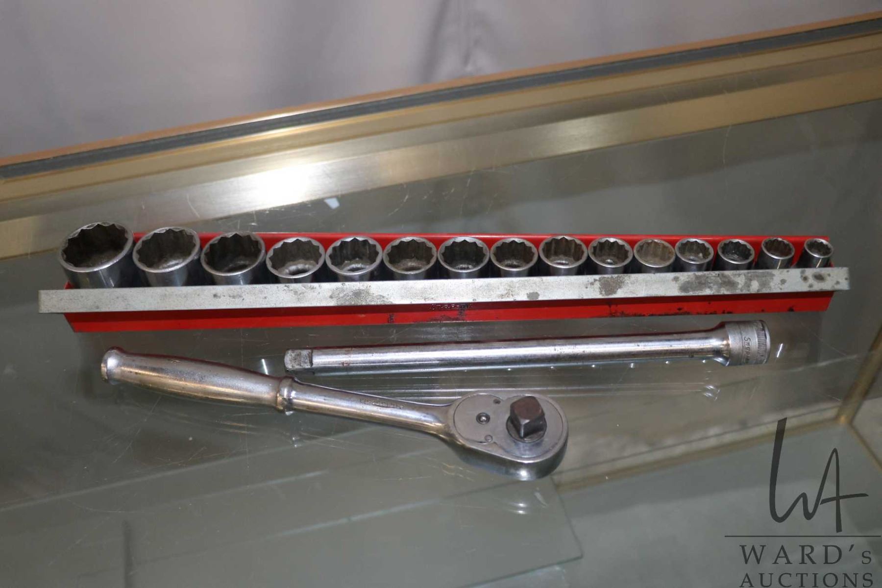 Snap-On fifteen pieces 1/2" drive socket set including 7/16" - 1 1/4" in tray plus ratchet and 12" extension