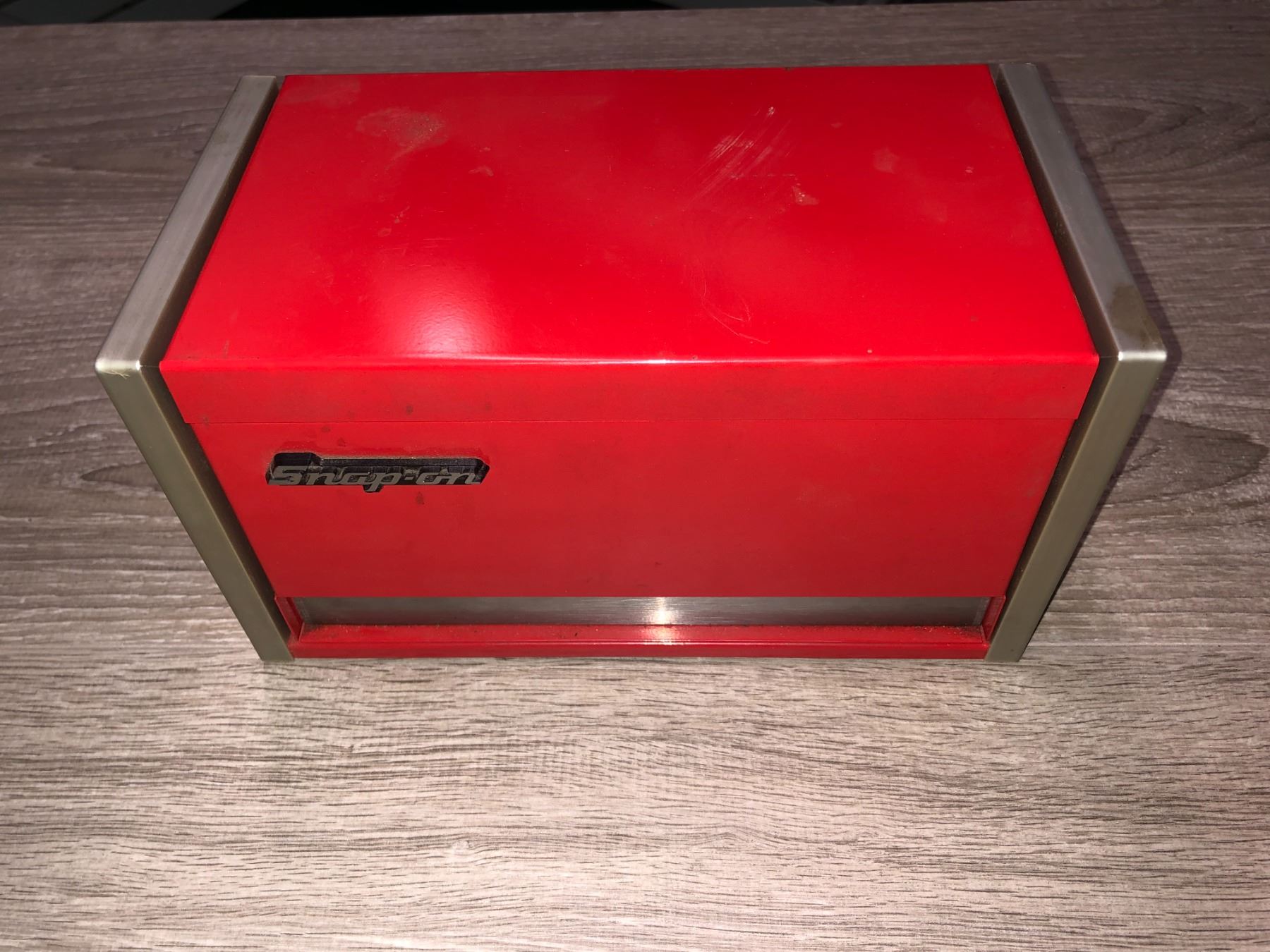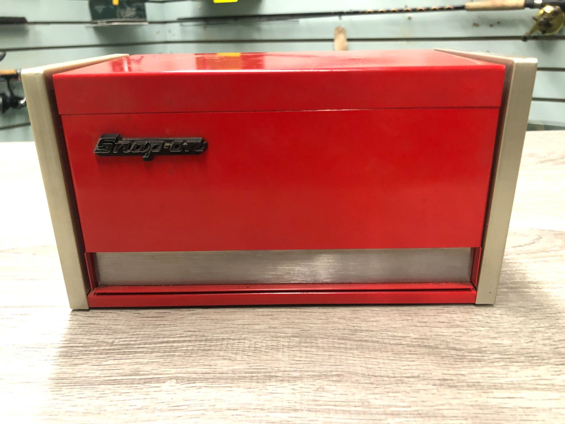 Snap-on mini metal tool cabinet 8 1/2 in. across by 4 1/2 wide stands 4 1/2 in. tall