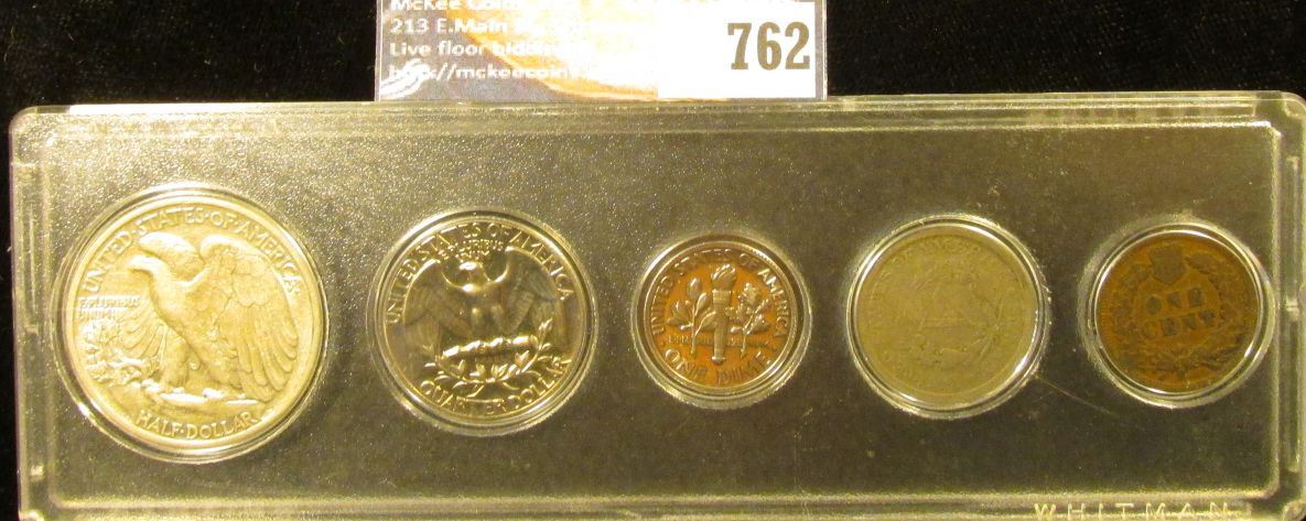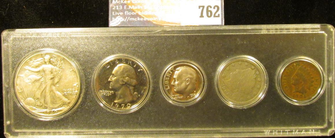 Snaptite case containing 1904 Indian Cent, 1906 Liberty Nickel, 1978S Proof Dime, 1970 S Proof Quarter, & 1940 P Walking Liberty Half-Dollar, EF.