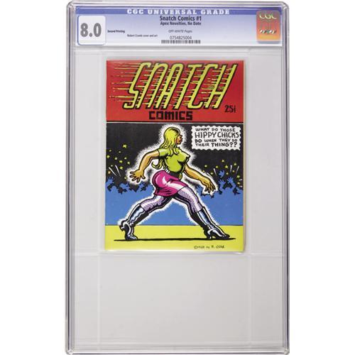 <B>Snatch Comics #1 Second Printing (Apex Novelties, 1968) CGC VF 8.0 Off-white pages.</B></I> Find out what those "hippy chicks" do when they do their "thing" -- maybe next time, they'll do it all over you! Underground comix at their most outrageous here, courtesy of Robert Crumb and S. Clay Wilson, with tons of nasty drawings for all you perv... we mean, art lovers out there! Fogel's Underground Comix Price Guide FN 6.0 value = $120; NM 9.4 value = $200. CGC census 10/06: 1 in 8.0, 1 higher. Adult themes, graphic sexual content.<BR><BR><b>Shipping:</b> Slabbed Comic (<a target="_blank" href="http://www.heritageauctions.com/common/shipping.php">view shipping information</a>)