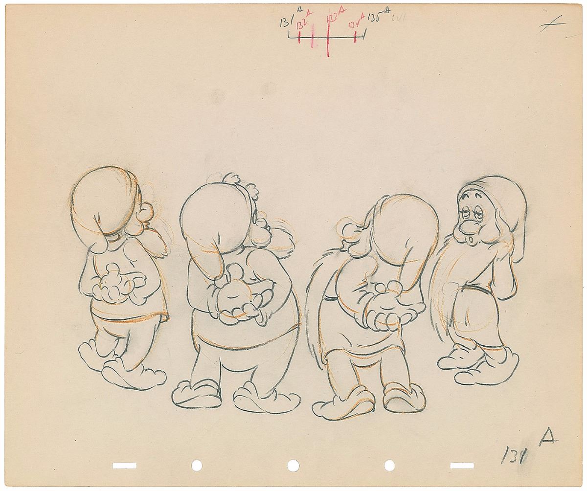 (Walt Disney Studios, 1937) Original production drawing featuring Sneezy, Happy, Bashful, and Sleepy from Snow White and the Seven Dwarfs, showing the four dwarfs whistling during the film’s memorable washing sequence. Accomplished in graphite and colored pencil on untrimmed 12 x 10 animation paper. Total image area measures 9.5 x 5. In fine condition.