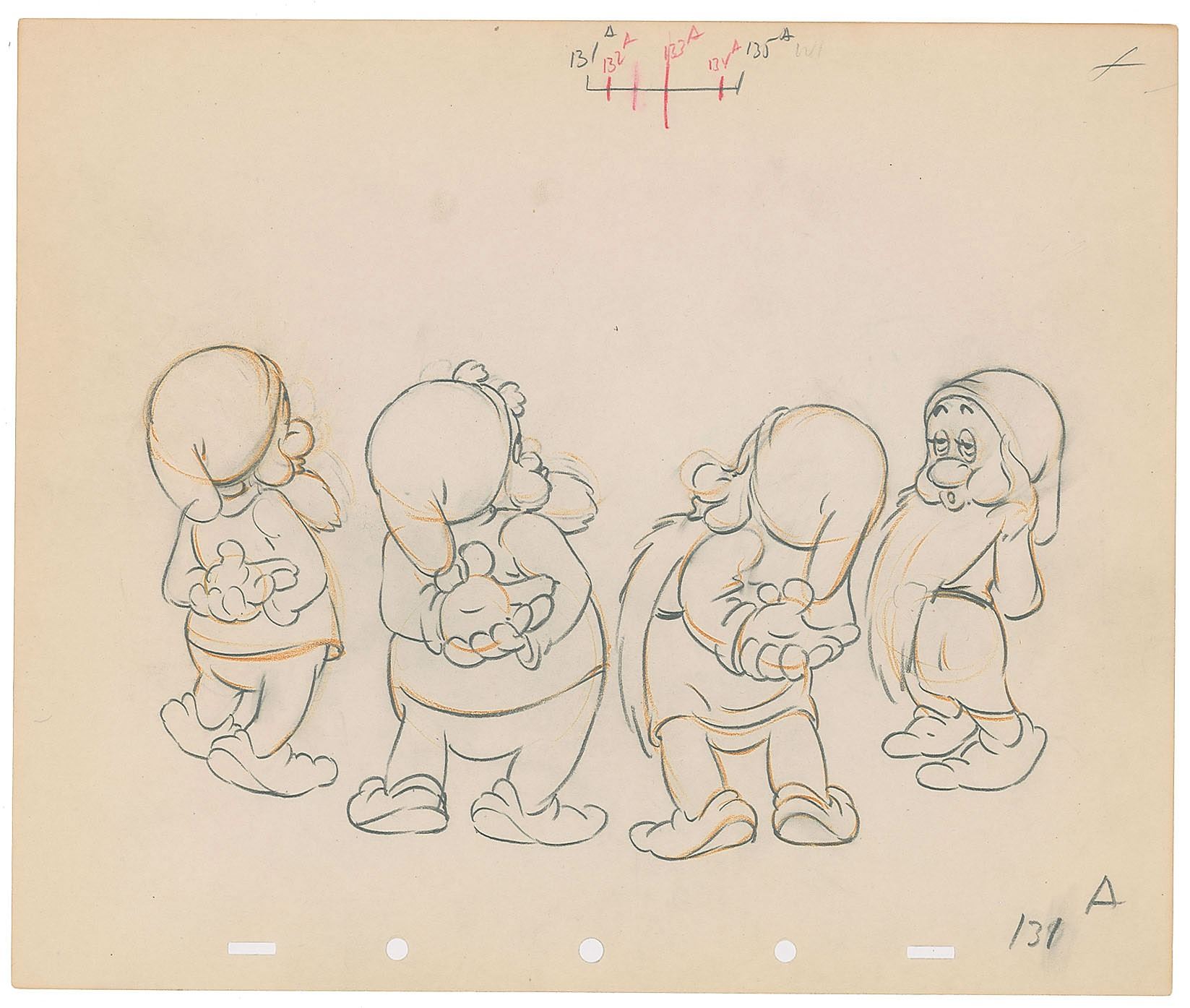 (Walt Disney Studios, 1937) Original production drawing featuring Sneezy, Happy, Bashful, and Sleepy from Snow White and the Seven Dwarfs, showing the four dwarfs whistling with their hands behind their backs. Accomplished in graphite and colored pencil on untrimmed 12 x 10 animation paper, marked "131A" in the lower right corner. Total image measures 9.5 x 5.25. In fine condition.