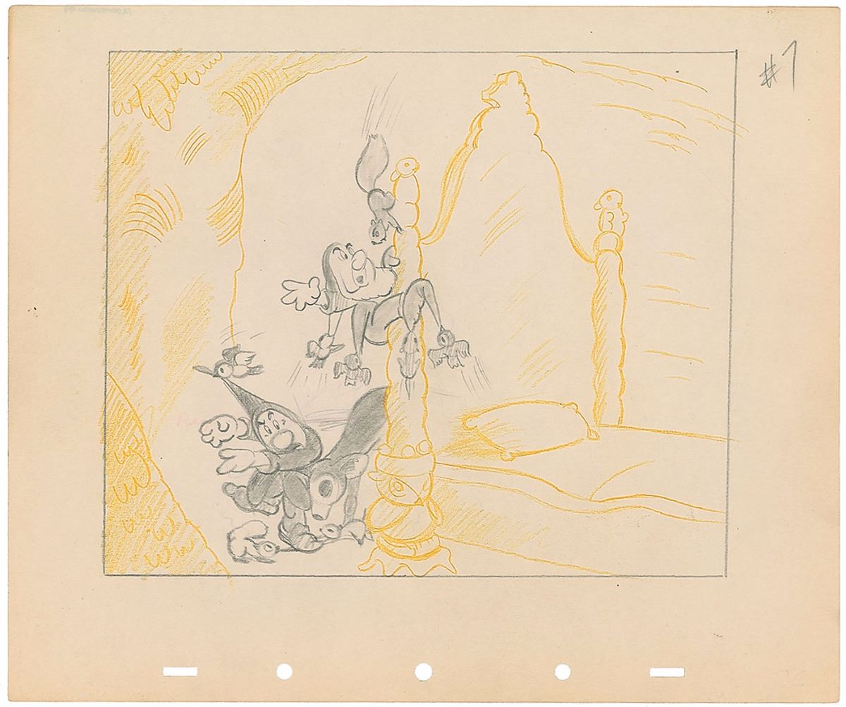 (Walt Disney Studios, 1937) Original production preliminary storyboard featuring Sneezy and Grumpy from Snow White and the Seven Dwarfs, depicting the pair being bombarded by animals during the film’s bed building sequence. Accomplished in graphite and colored pencil on untrimmed 12 x 10 animation paper. Image measures 9 x 7.5. In fine condition, with pin holes to upper corners.