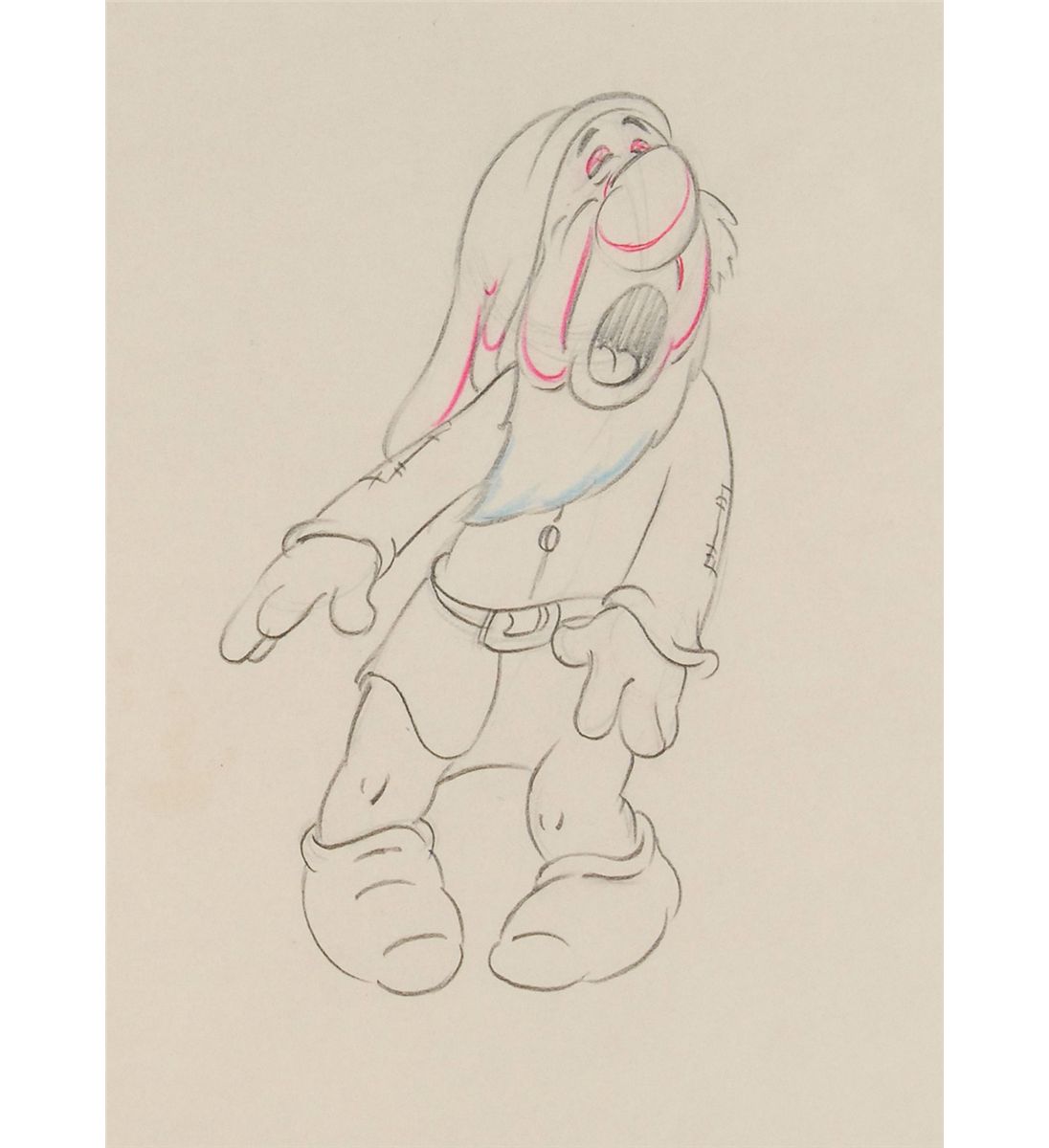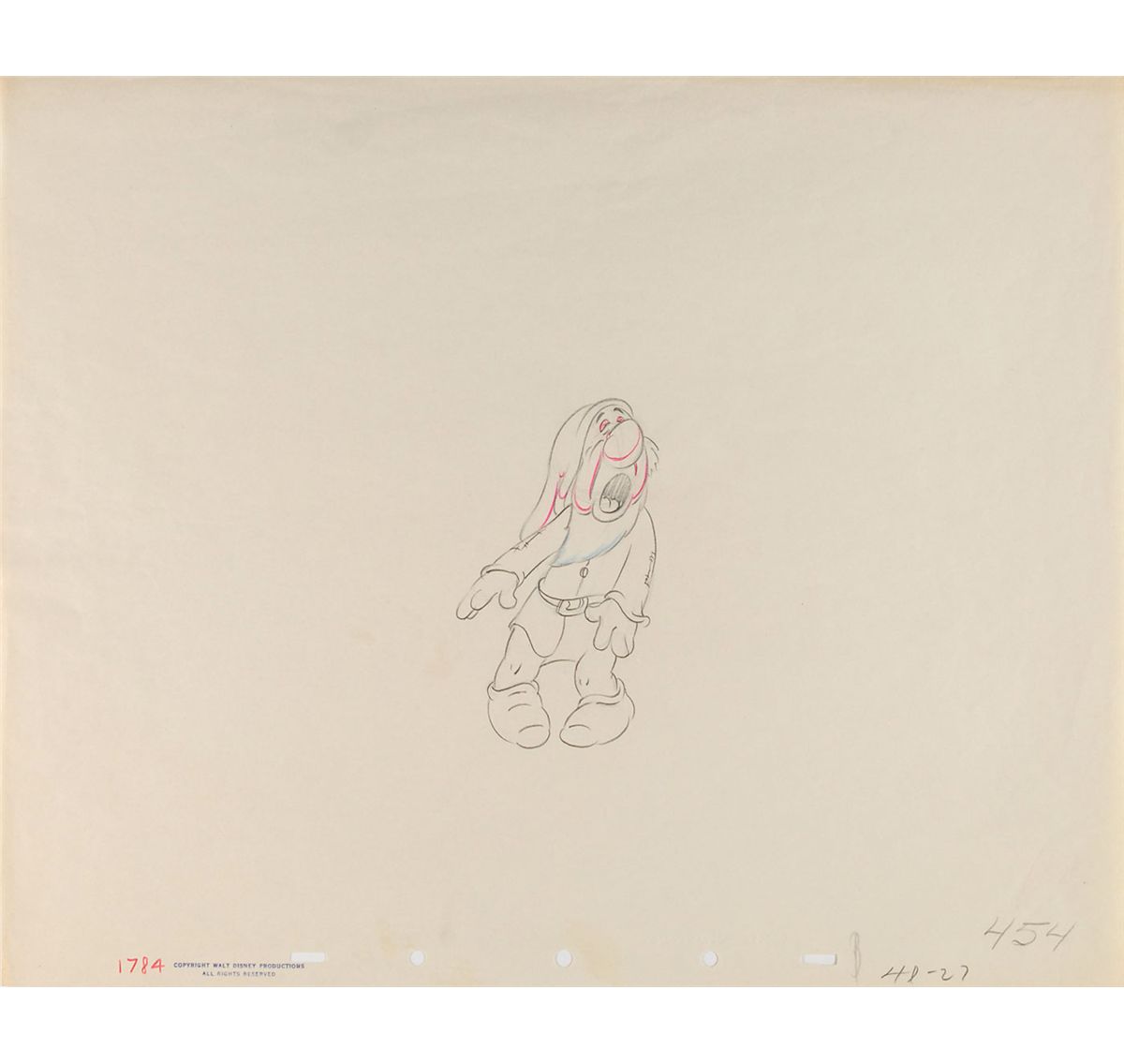 (Walt Disney Studios, 1937) Original production drawing featuring Sneezy from Snow White and the Seven Dwarfs, showing the dwarf as he is about to sneeze. Accomplished in graphite and colored pencil on untrimmed 15.5 x 12.5 animation paper, which also bears Courvoisier Galleries Walt Disney Productions ink and blind stamps, and a red pencil inventory number notation. Image measures 2.75 x 4.75. In fine condition.