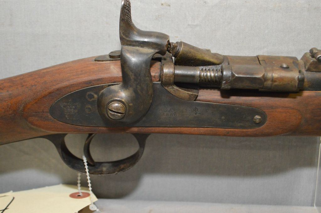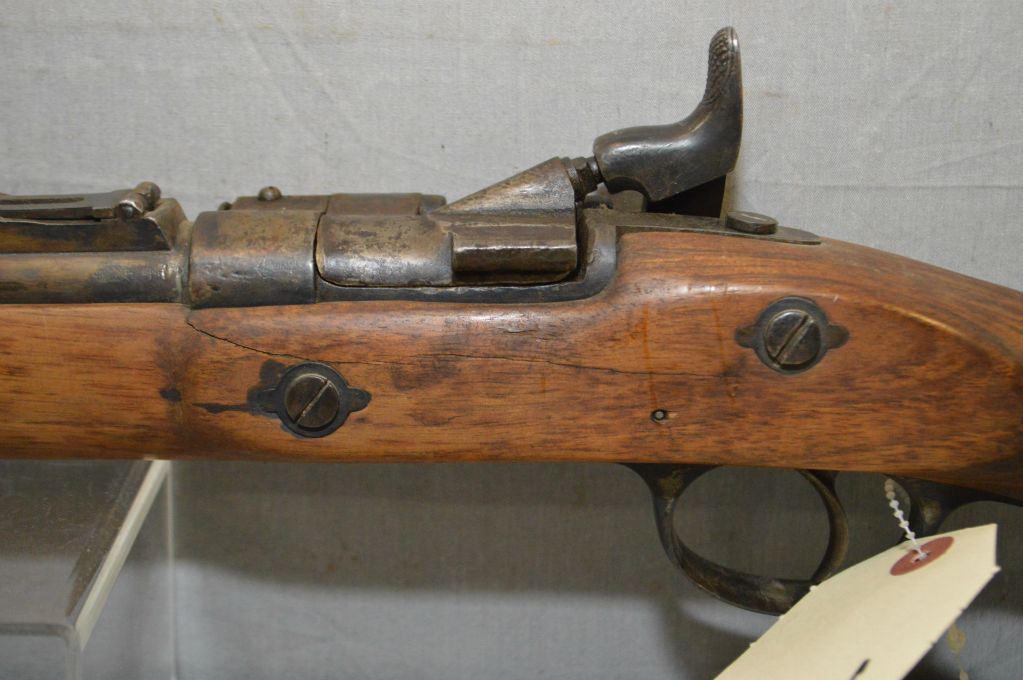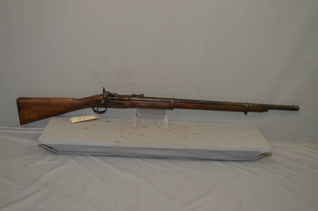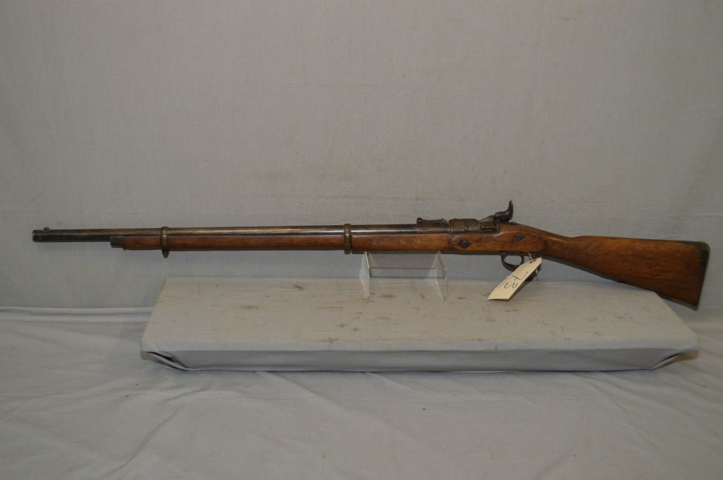 Snider Enfield ( BSA Co. ) Model 1866 Mark II ** .577 Snider Cal Two Band Full Wood Military Rifle w/ 30 5/8" bbl [ patchy faded blue finish, side bayonet lug ground off, barrel sights, fair sanded wood, with slight age crack behind lock, metal furniture, including trigger guard, butt plate, etc., missing ramrod ] Ser # Nil ANTIQUE NO PAL REQ