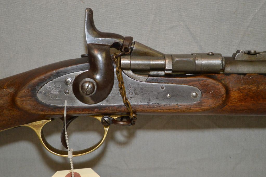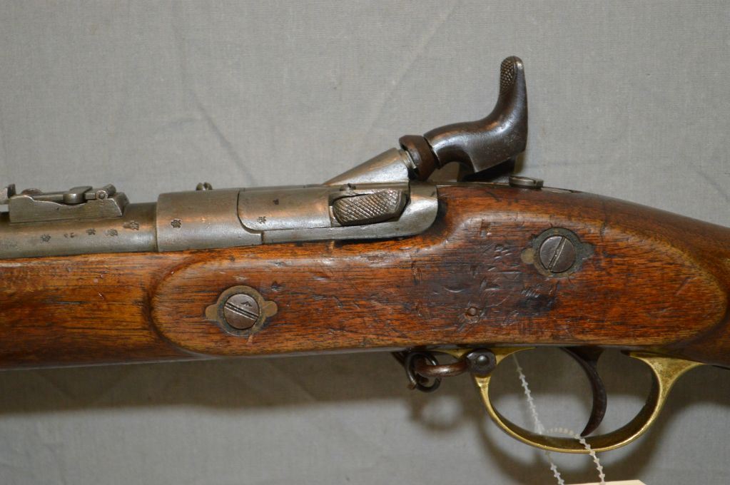 Snider Enfield L.S. A.Co. 1871 .577 Snider cal Cut Down to Cadet Carbine w/ 19 1/4" bbl [ blue finish fading to grey in most areas, brass trigger guard & butt plate w/ nipple protector w/brass chain ( 181 ) ] Ser # Nil Antique No Pal Req