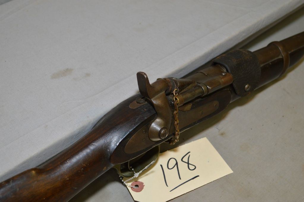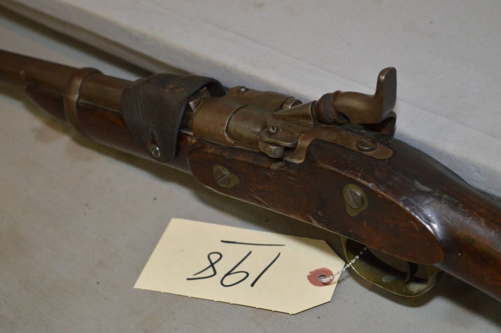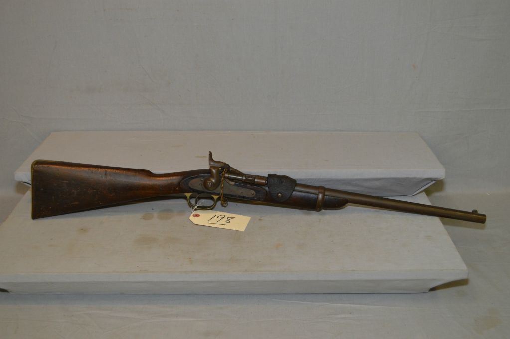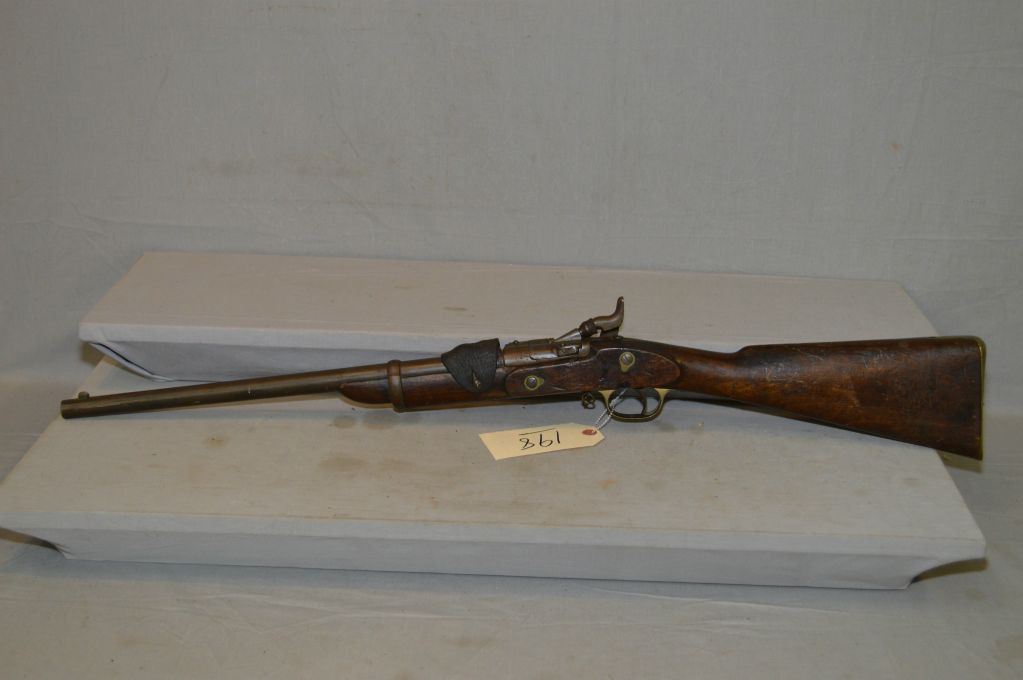 Snider Enfield Model 1870 Mark III Cavalry Carbine .577 Snider cal Single Shot Military Carbine w/ 19 1/4" bbl [ faded blue finish turned brown, original carbine sights including leather protective cover, good wood stamped 8-6-6 also carved JT on right side, and ALN on left side, brass trigger guard, butt plate w/trap, nipple protector w/chain ] Ser # 3714 on flip block ANTIQUE NO PAL REQ