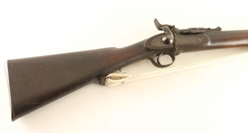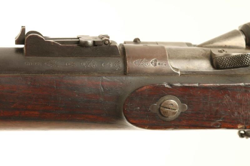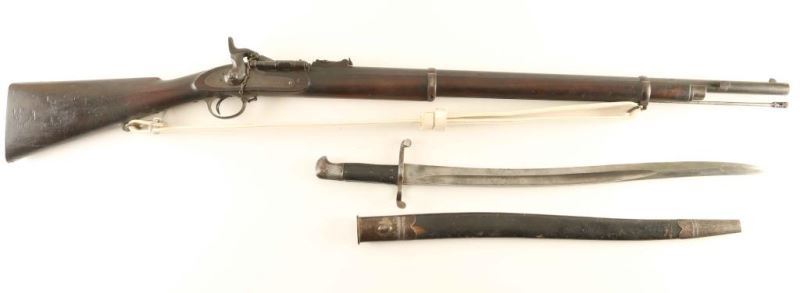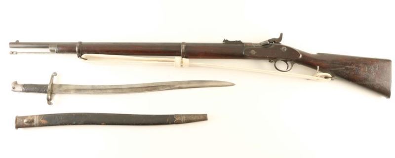 NVSN. Early British military breech loading rifle chambered for the .577 Boxer cartridge manufactured in 1869. Features a blued finish, 30 1/2" steel barrel, fixed blade front sight, flip up ladder rear sight, two barrel bands, steel endcap, cleaning rod, rounded trigger, steel trigger guard, firing pin cap, flat faced hammer, white leather sling, and a smooth walnut straight grip shoulder stock with metal buttplate. Includes an original sword style bayonet with scabbard. Lock is marked '1869/Enfield' and [crown/VR], receiver 'III' and other various military proofs, stock 'DG' inside of a diamond, 'MGA293' and a round cartouche with 'R[crown]M-Enfield/1'. Rifle exhibits approximately 50% of its original finish with a balance of the metal surfaces turned to a dark brown patina. Action is mechanically sound, bore is excellent and the wood stock is very good with several dings. Condition is NRA Fine ***Antique Firearm*** From The John F Sukey Collection