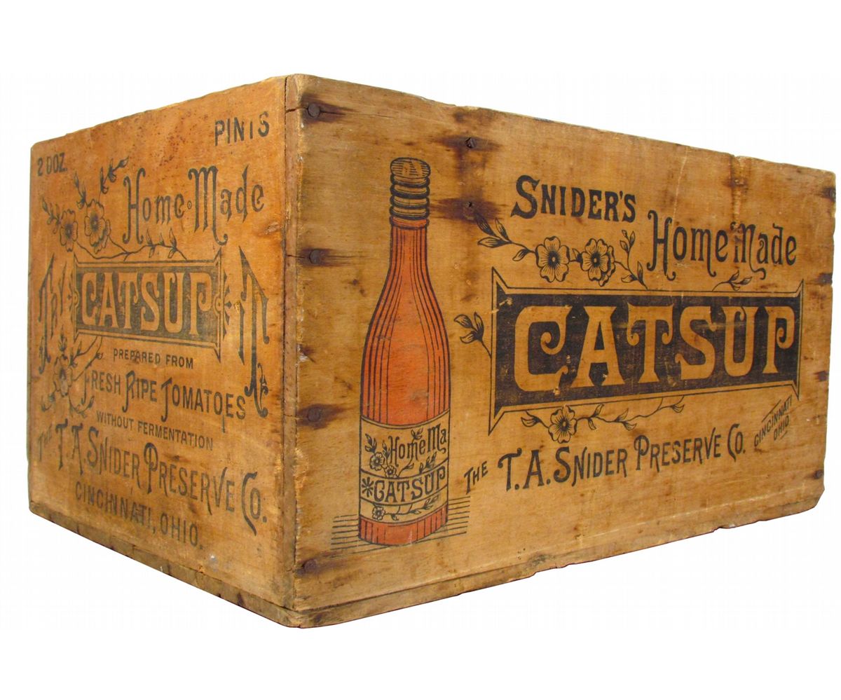 Snider's "Homemade" Catsup Wood Shipping Crate. No lid otherwise very good condition. 20 1/2 X 10 1/2 X 13 3/4 inches.