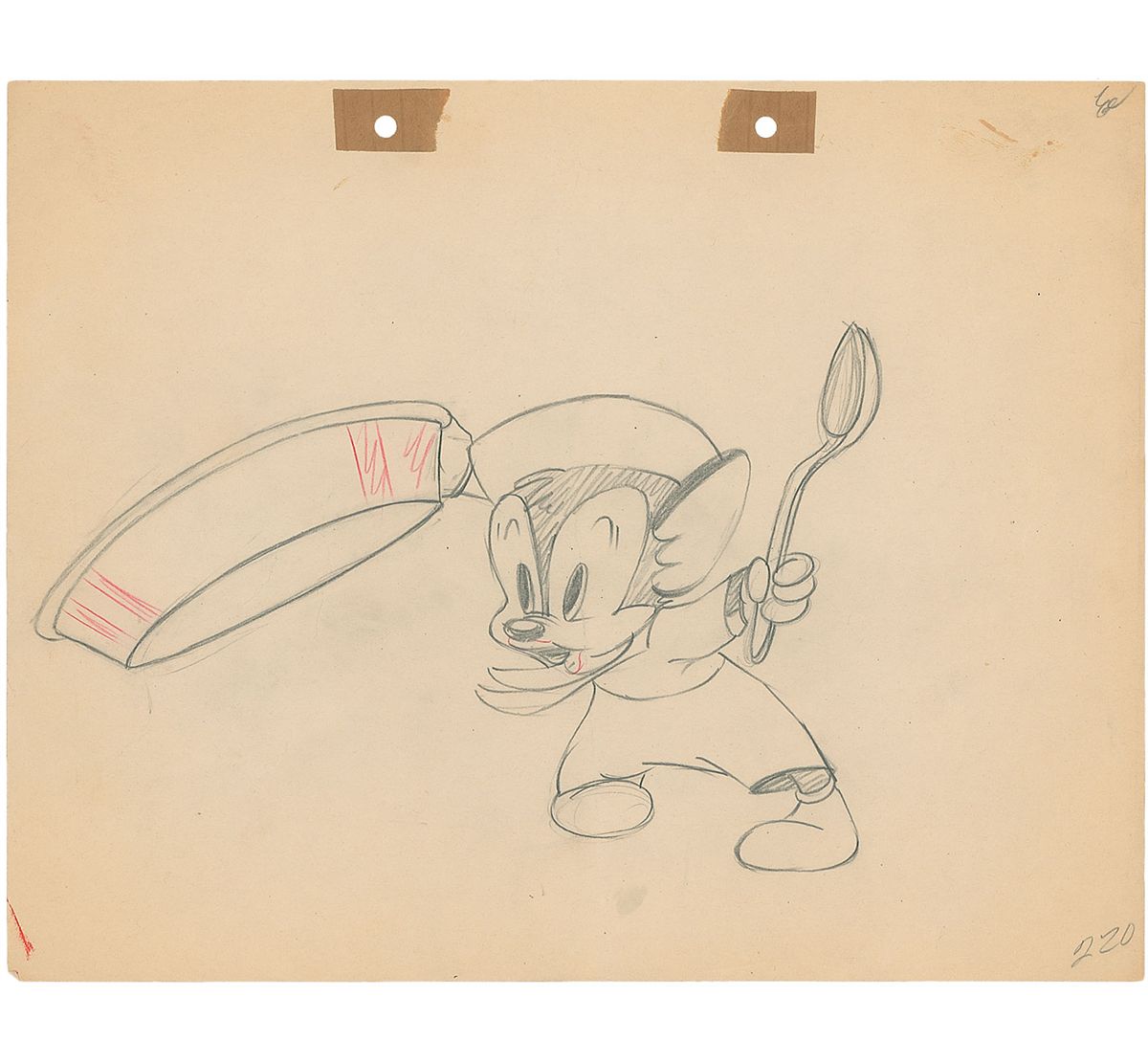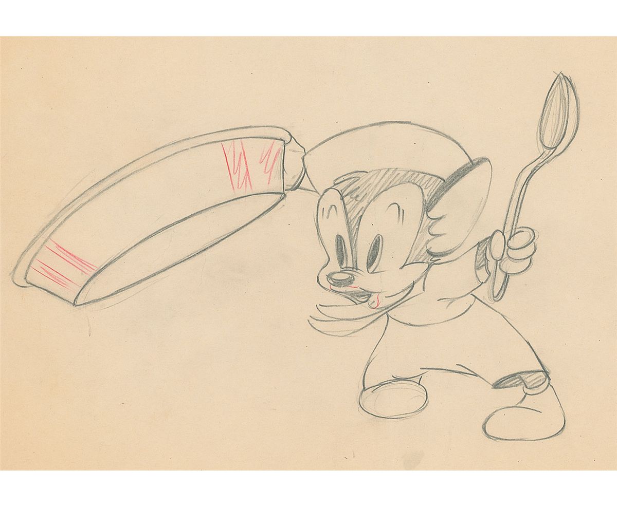 (Warner Brothers Studios, Circa 1940s) Rare original production drawing featuring Sniffles from a 1940s cartoon. Accomplished in graphite on untrimmed 12 x 9.5 animation paper. Image of Sniffles banging on a metal dish with a spoon measures 9 x 6. In fine condition, with a bit of scattered light toning and soiling.