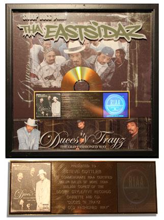RIAA gold award commemorating the sale of 500,000 copies of Snoop Dogg's 2001 album, ''Duces 'n Trayz: The Old Fashioned Way.'' Framed award includes an oversize poster of the acclaimed rapper, a gold CD and a commemorative plaque reading in part: ''Presented to Steve Gottlieb / To Commemorate RIAA Certified Gold Sales of More Than / 500,000 copies of the Doggy Style/TVT Records / Cassette and C.D…'' with an official RIAA (Recording Industry Association of America) hologram certifying the award. Frame measures 17'' x 17'' and is near fine.