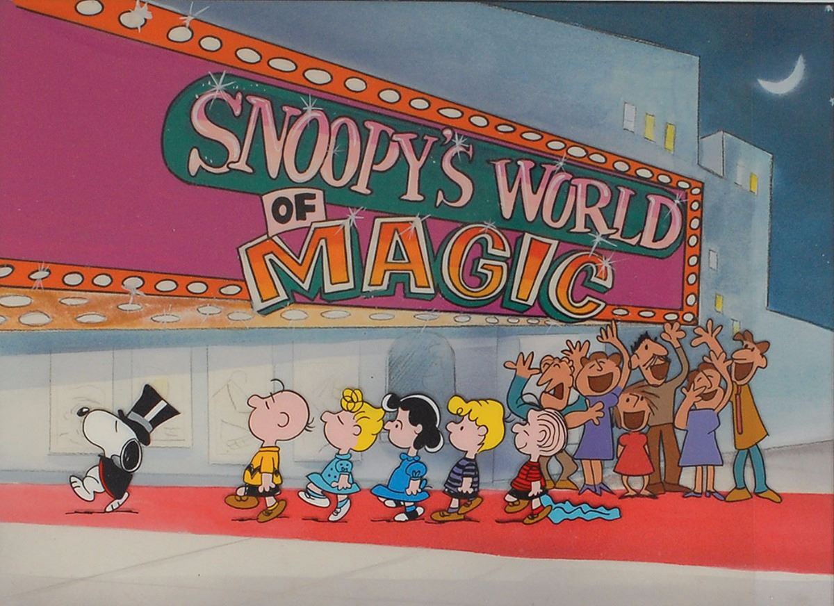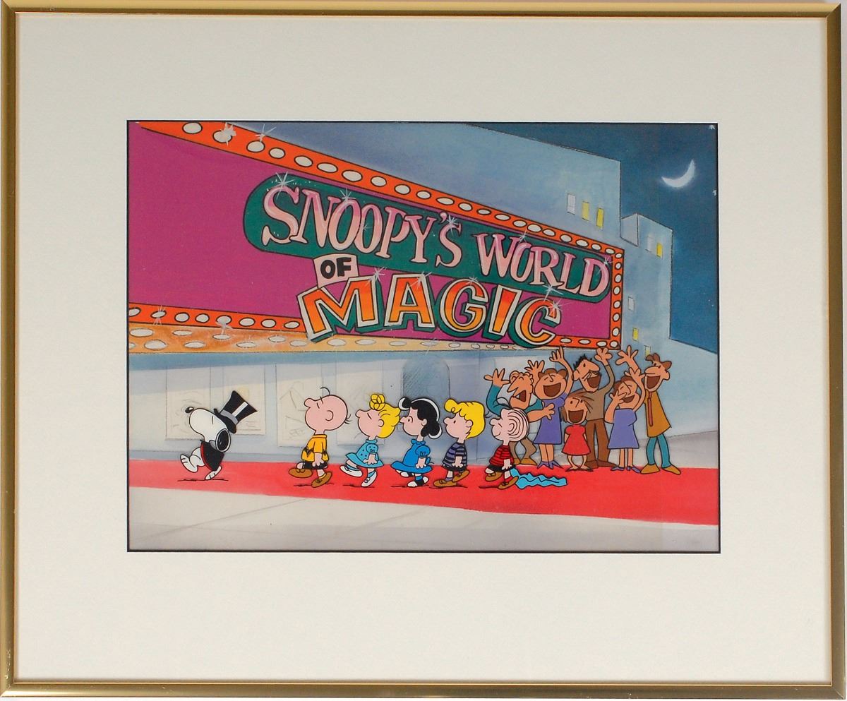 (Bill Melendez Productions, circa 1980s) Original production key master background set-up featuring Snoopy, Charlie Brown, Sally, Lucy, Schroder, and Linus promoting Snoopy’s World of Magic, showing the gang walking confidently along a red carpet. The cels are placed on a hand-painted background, with the marquee cel trimmed and applied to the background. Each character image measures about 1 x 2, with a total image size of 11.25 x 7.5, with a mat opening of 12 x 8.75. This piece is also framed to an overall size of 17.5 x 14.5. Affixed to the back of the frame is an additional cel showing a pair of spotlights. In fine condition. In 1989, Charles Schulz supervised a live action stage show on a national tour called Snoopy’s World of Magic,