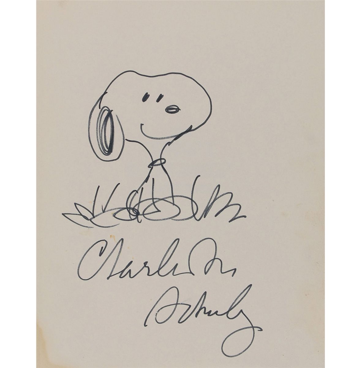 Signed book: The ‘Snoopy, Come Home’ Movie Book. First edition. NY: Holt, Rinehart and Winston, 1972. Hardcover with dust jacket, 8.75 x 11. Boldly signed on the first free end page in black felt tip, “Charles M. Schulz,” adding a terrific and highly desirable sketch of Snoopy above. Autographic condition: a bit of soiling and slight dampstaining to lower left of signed page, otherwise fine condition. A wonderful Peanuts piece with a nice sketch by the great cartoonist.