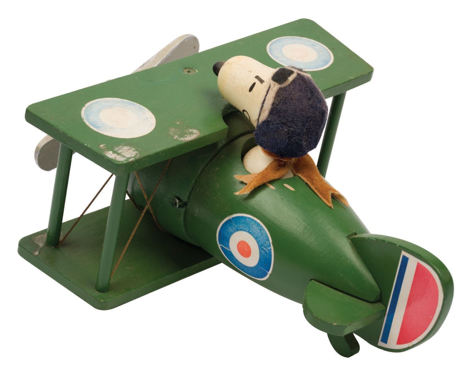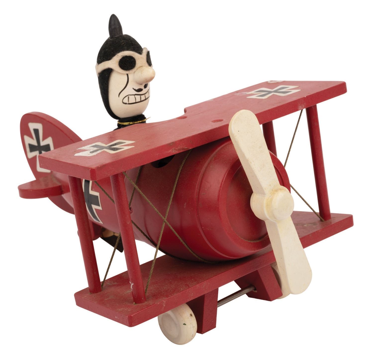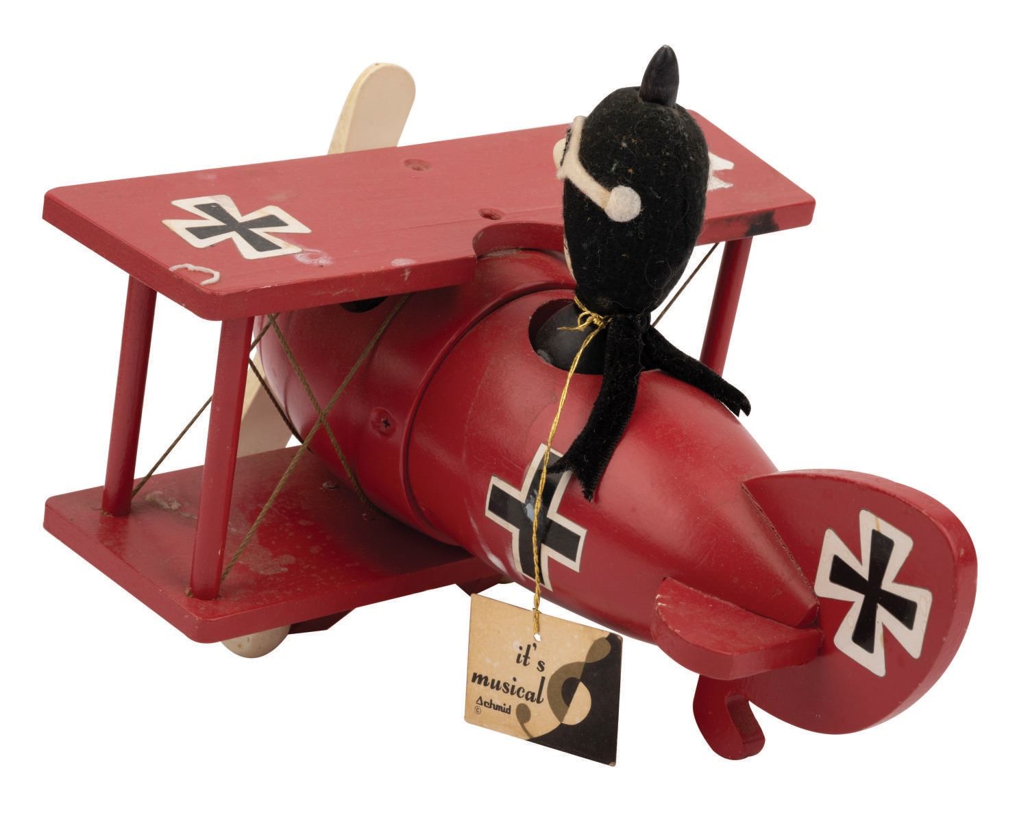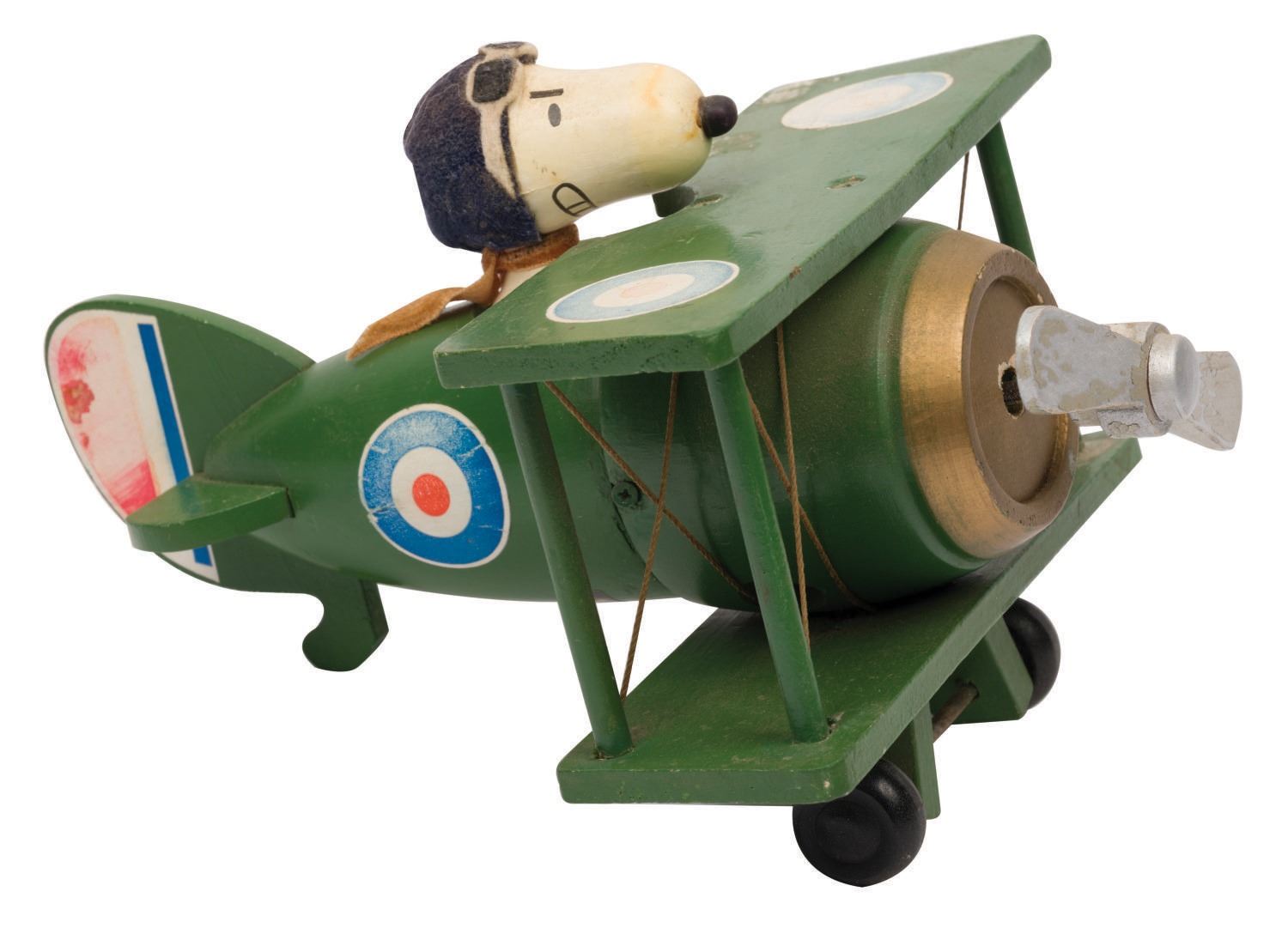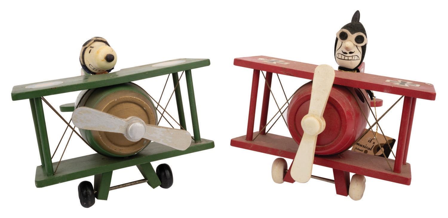 (Schmid, 1968/70) A rare pair of wooden figural music boxes featuring Snoopy and The Red Baron. Produced by Schmid in 1968 and 1970, the Red Baron measures 8"x6.5"x5.75" tall, and Snoopy measures 8"x6.5"x5" tall. The Baron plays "Auf Wiedersehen" and Snoopy plays "When The Saints Go Marching In." Both are in good condition with soiling and wear throughout. Both have some light water staining and both have faded or damaged stickers.