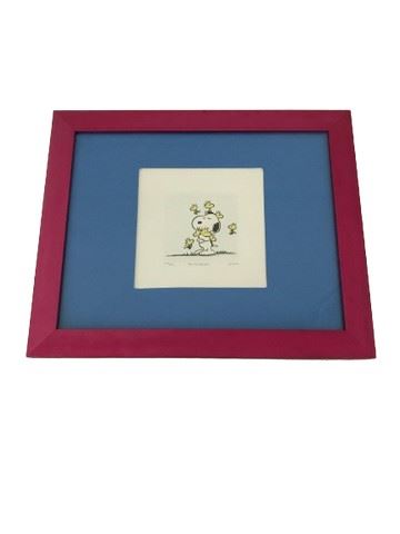 Snoopy and Woodstocks etching with hand tinted color. Sowa & Reiser. Framed (glass). From United Feature Syndicate, Inc. Numbered 101/500. Image size: 2"x2". Frame size: 11"x9".