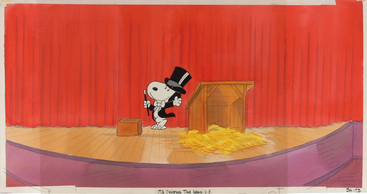 (Bill Melendez Productions, 1984) Original production cel and pan production background setup from Peanuts, showing Snoopy wearing a tuxedo and top hat against a stage backdrop with a small hay shed. The cel is placed on a hand-painted pan production background from It’s Christmastime Again, Charlie Brown. Image measures 2.5 x 3.25, with overall dimensions of 18.5 x 11. In fine condition.