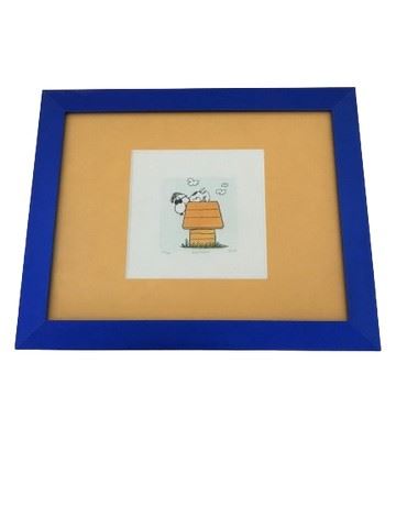 Snoopy on Dog House Sowa & Reiser hand painted, limited edition etching with hand tinted color. Framed (glass). Numbered 430/500. Image size: 2"x2". Frame Size: 11"x9".