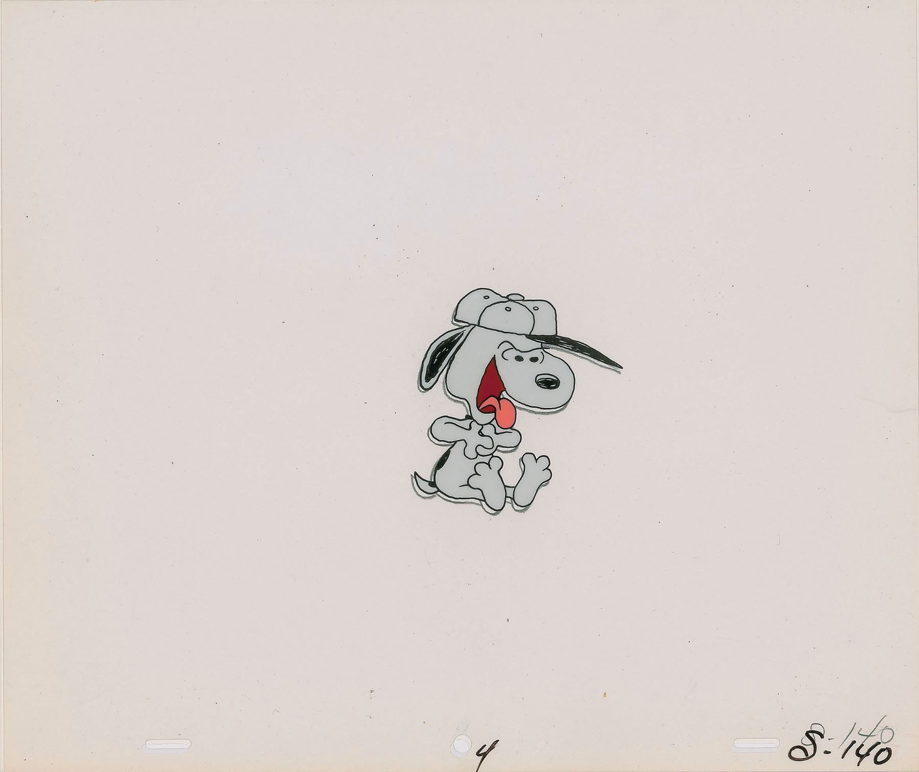 (Bill Melendez Productions, circa 1980s) Original production cel and matching production drawing featuring Snoopy from a Peanuts special, showing Charlie Brown's pet dog seated, wearing a cap, and laughing diabolically. Image measures 2.75 x 3, with overall dimensions of 12. x 10.5. The cel is marked, "4, S-140." The matching production drawing is accomplished in graphite on untrimmed 12.5 x 10.5 animation paper, and is marked in the lower right corner, "S-140." In overall fine condition.