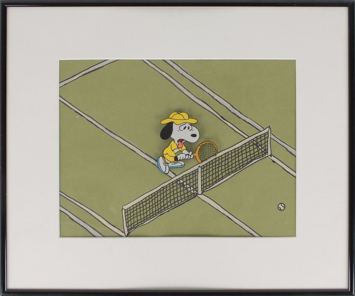 (Bill Melendez Productions, 1975) Original production cel featuring Snoopy from You're a Good Sport, Charlie Brown, showing the exhausted dog during a tennis match. The cel is placed on a hand-painted custom prepared background. Image measures 3 x 3, with a mat opening of 12 x 9. This piece is also framed to an overall size of 18.25 x 15.25. In fine condition.