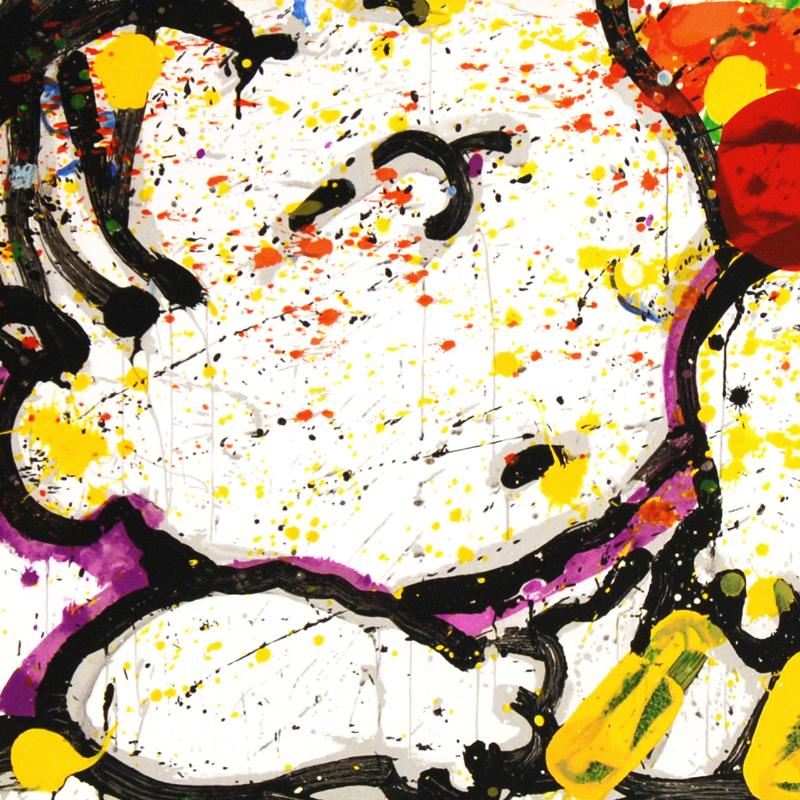 Master Artist Tom Everhart is the protege of famed "Peanuts" creator, Charles M. Schulz (1922â€"2000). As the only artist in the world granted the rights to draw the "Peanuts" characters in his own work, Everhart creates vibrant, extremely collectible rainbow masterpieces featuring Snoopy, Woodstock and the gang. "Snooze Alarm Boogie, 7:15 AM" is a limited edition hand pulled original lithograph on museum quality deckle-edge paper, numbered and hand signed by Everhart! Includes certificate of authenticity! Measures approx. 52" x 20" (image only/no border). This artwork was created on one of two rare antique Marinoni Voirin lithograph presses that date back to the 1800's, and are reputed to come from the Paris print shop used by Henri Toulouse-Lautrec. There are only 7 of these magnificent beasts left in the world: the smaller one (with a print bed size of 25" x 35"), weighs 9 tons, and the larger one weighs in at 11 tons (print bed size 31" x 47"). The significance of this is that the lithographs produced by this method are of the finest quality, using techniques that are so labor and time intensive that very few master printers know how to operate and care for these presses today. Each lithograph is created with hand-mixed colors applied one at a time - a highly trained and synchronized team must hand feed each museum-quality sheet of paper through the press numerous times in order to set the colors and impressions, while the Chromist - a trained color specialist - adjusts each color by look and feel to match the original artwork, as if mixing a potion. The result is an image with maximum pigment saturation, formed through rich layers of color that imbue the artwork with a permanency of brilliance - proven over centuries to last. In contrast, today's printers use a method more akin to a dot matrix style application, with the colors all premixed and sprayed onto a sheet in a uniform layer, resulting in a much less saturated image that is susceptible to fading and imperfect color reproduction. This is one of the final Tom Everhart editions to be printed using this very special technique.